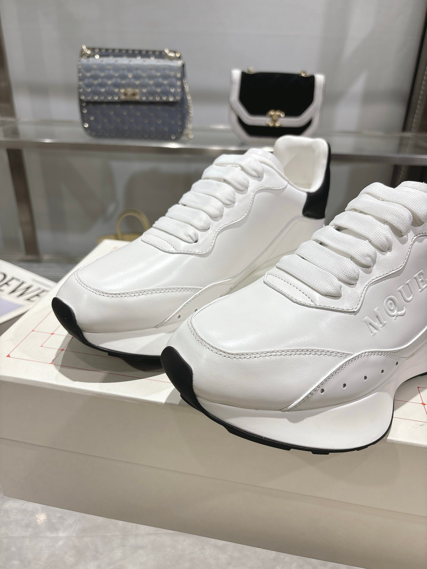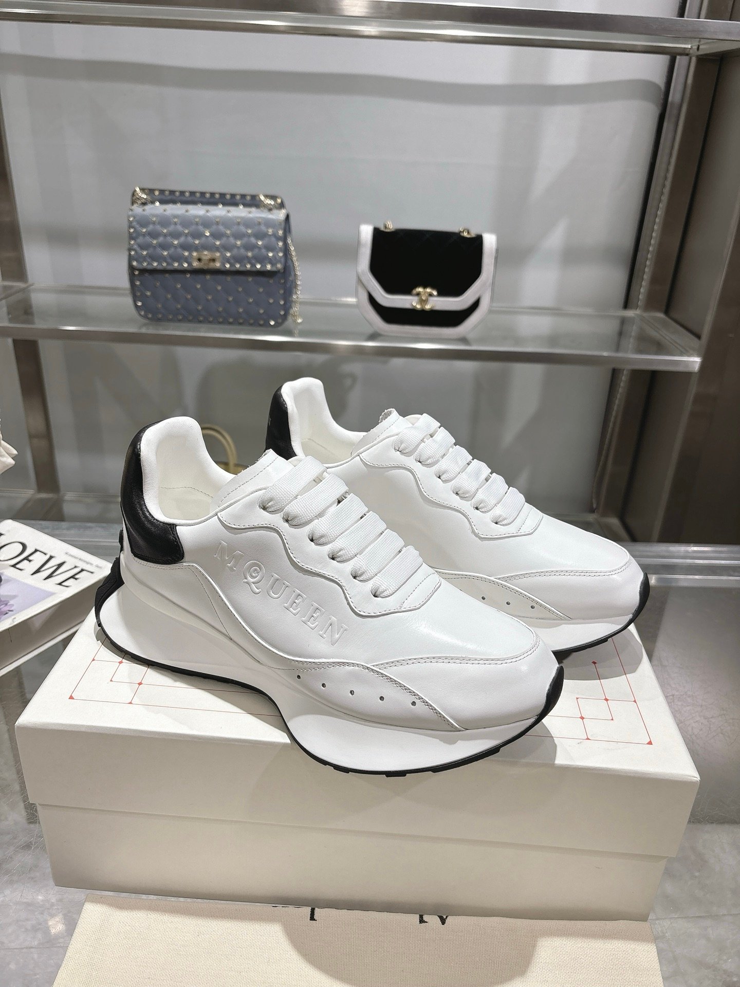 These chunky sneakers embody Alexander McQueen’s signature British luxury, featuring a sleek white smooth calfskin upper with a bold black heel tab and outsole contrast. The embossed “MCQUEEN” lettering on the side and sculptural wave sole blend avant-garde design with modern streetwear functionality, perfect for daily wear and street styling.