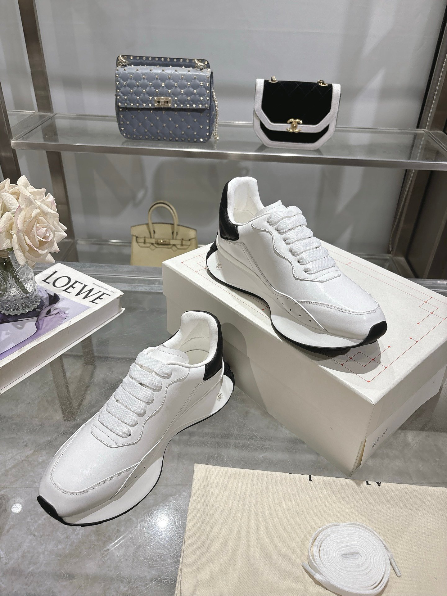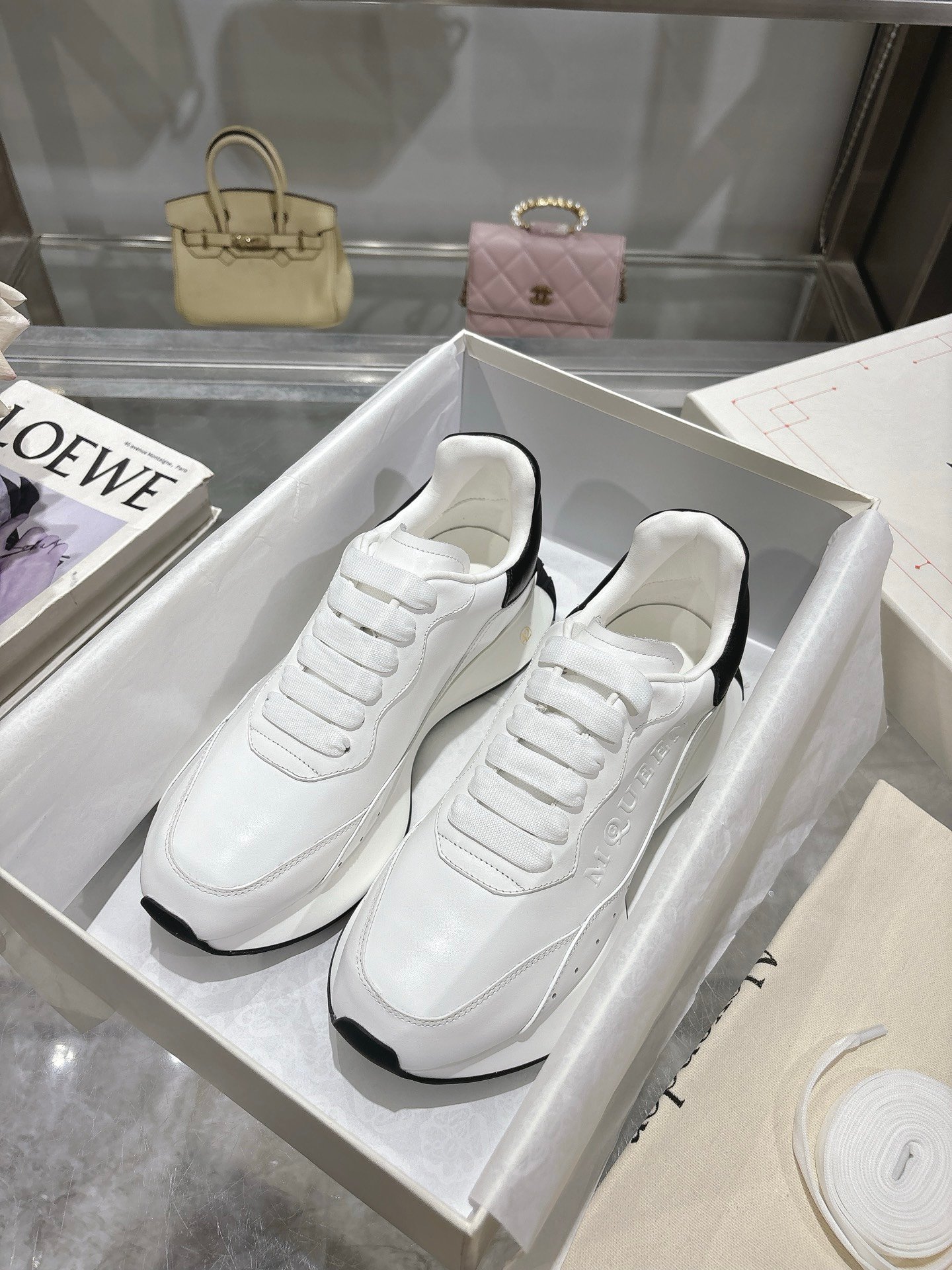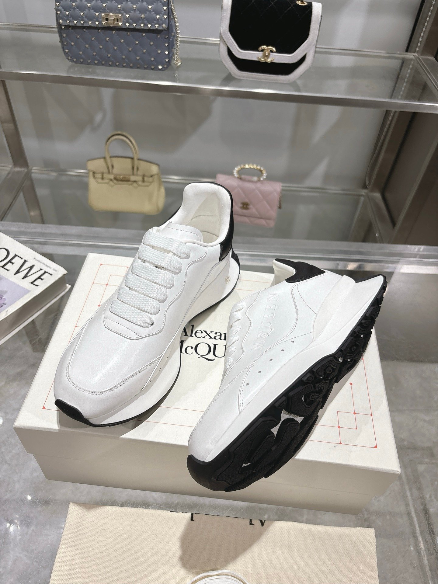 The timeless white-and-black colorway pairs effortlessly with jeans, dresses, or tailored outfits, making it a versatile wardrobe staple. Whether styled with streetwear or minimalist ensembles, these McQueen sneakers elevate casual wear with iconic design and premium craftsmanship.