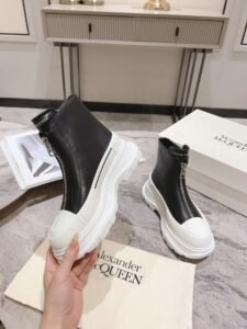 The embossed “MCQUEEN” logo on the side and rich burgundy elastic laces deliver authentic, eye-catching branding. The padded ankle collar and cushioned insole provide all-day comfort, making these sneakers suitable for extended wear without sacrificing style.