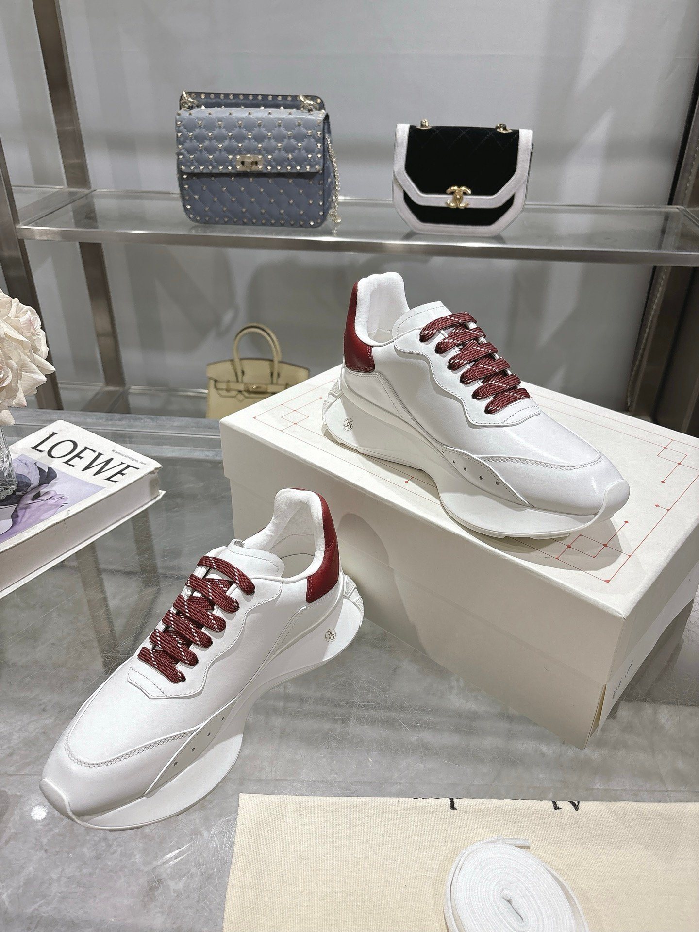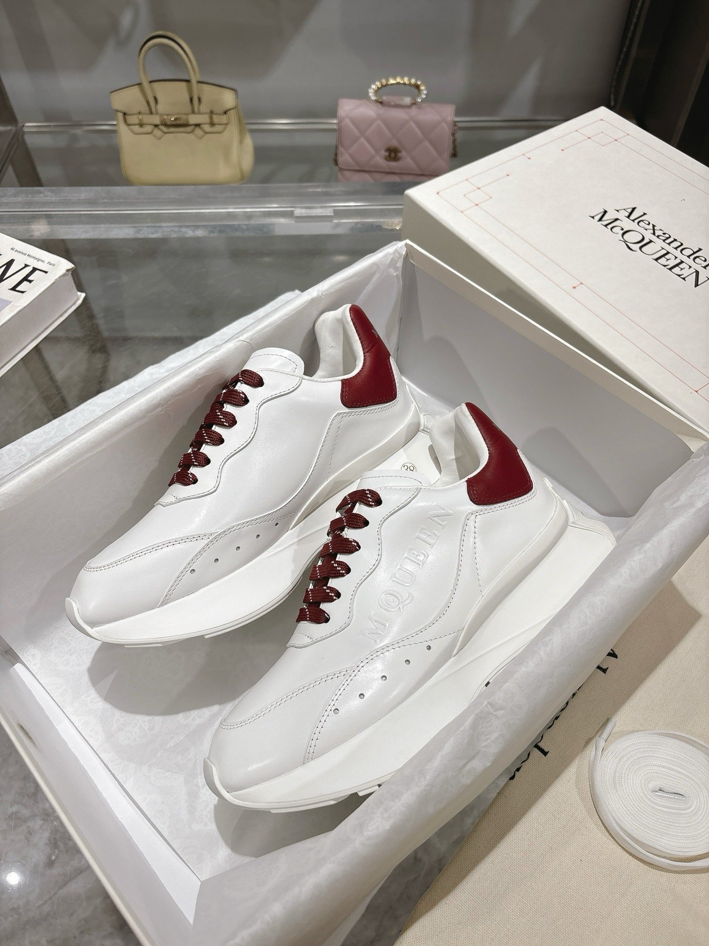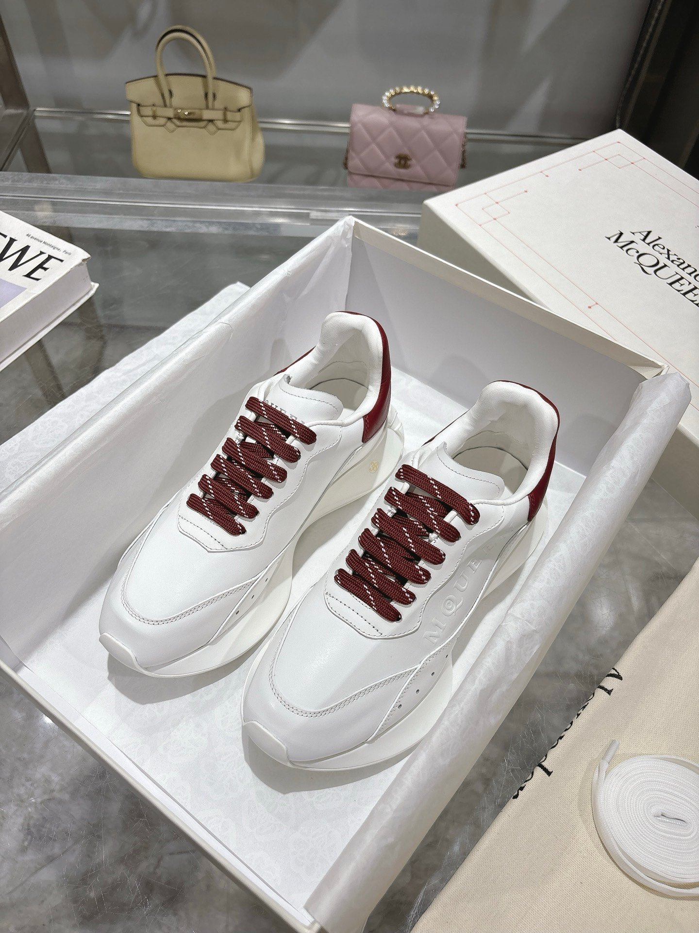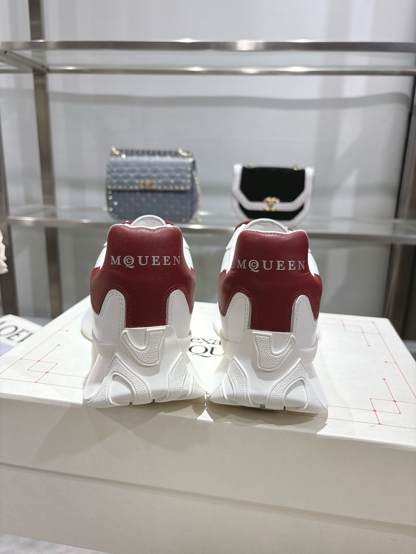 The timeless white-and-burgundy colorway pairs effortlessly with jeans, dresses, or tailored outfits, making it a versatile wardrobe staple. Whether styled with streetwear or minimalist ensembles, these McQueen sneakers elevate casual wear with iconic design and premium craftsmanship.