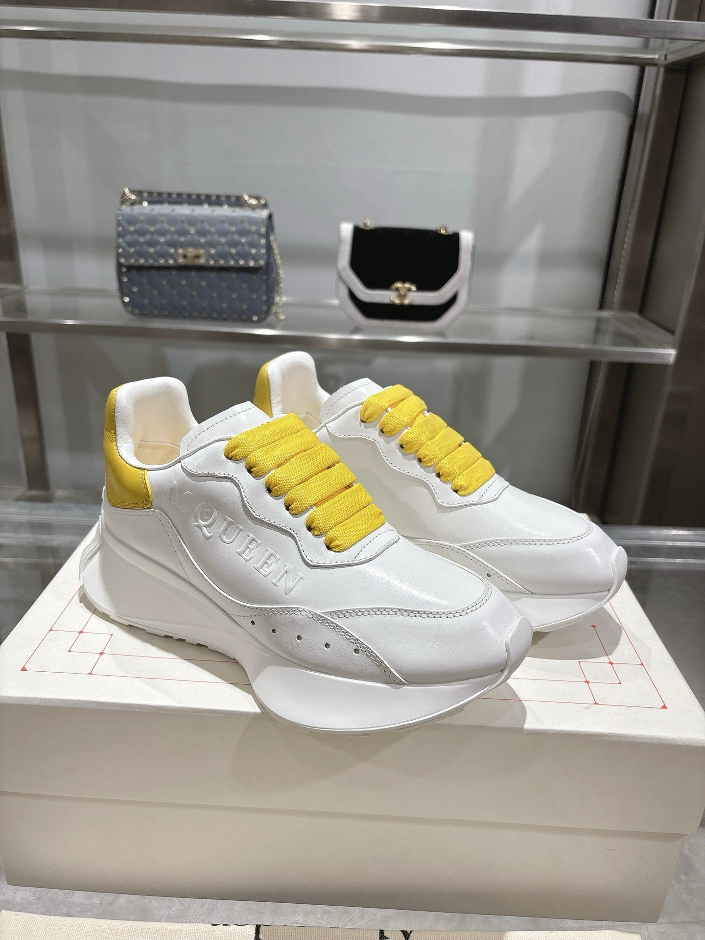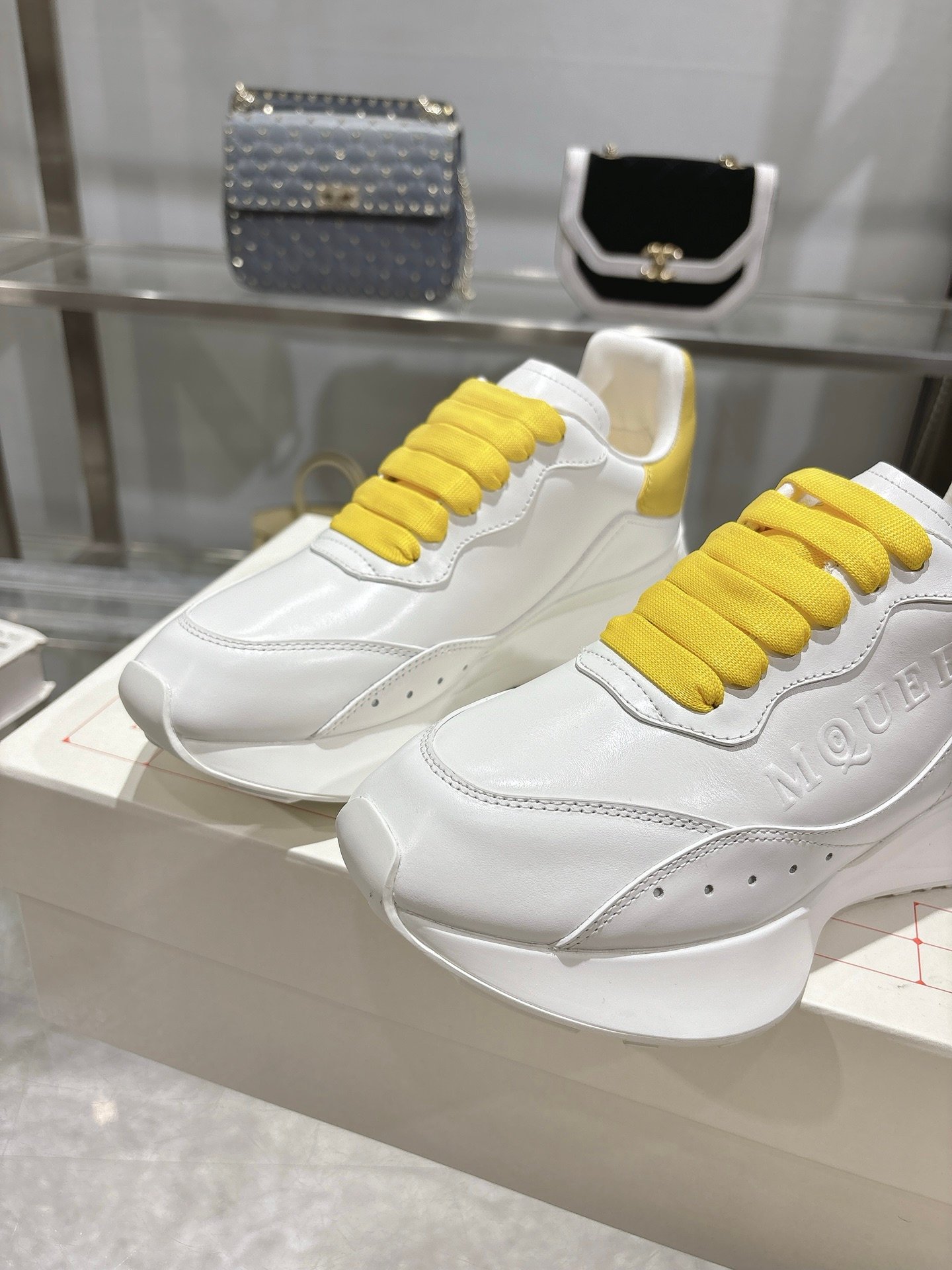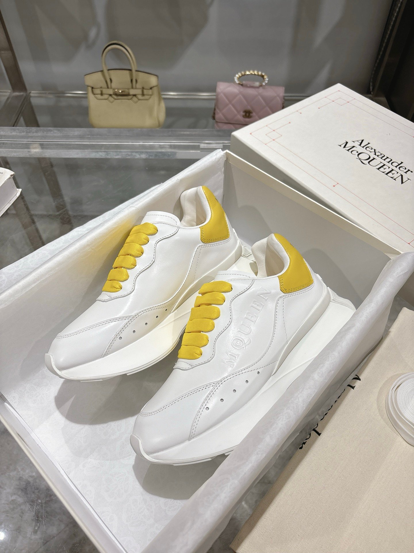 The fresh white-and-yellow colorway pairs effortlessly with jeans, dresses, or tailored outfits, making it a versatile wardrobe staple. Whether styled with streetwear or minimalist ensembles, these McQueen sneakers elevate casual wear with iconic design and premium craftsmanship.