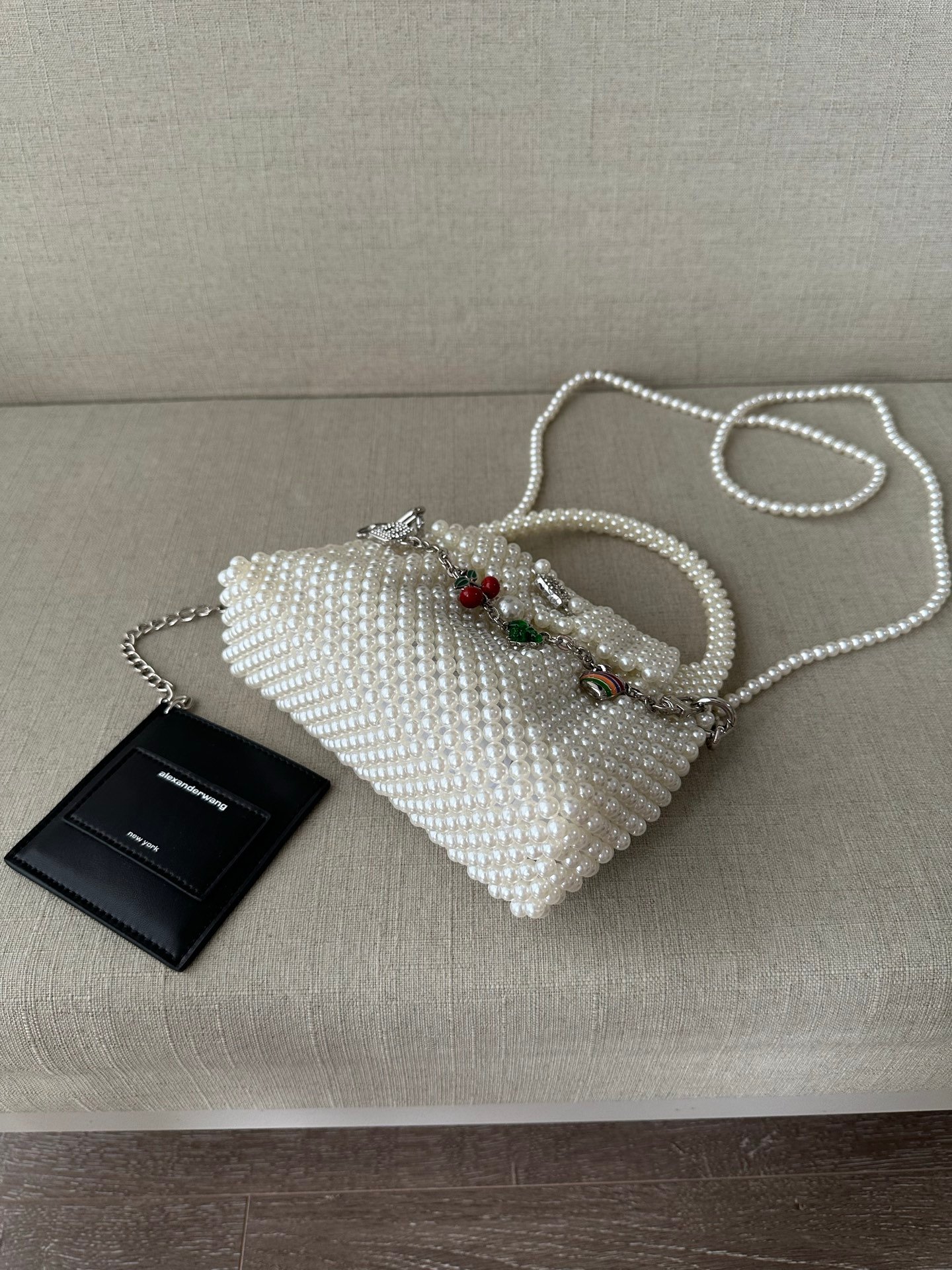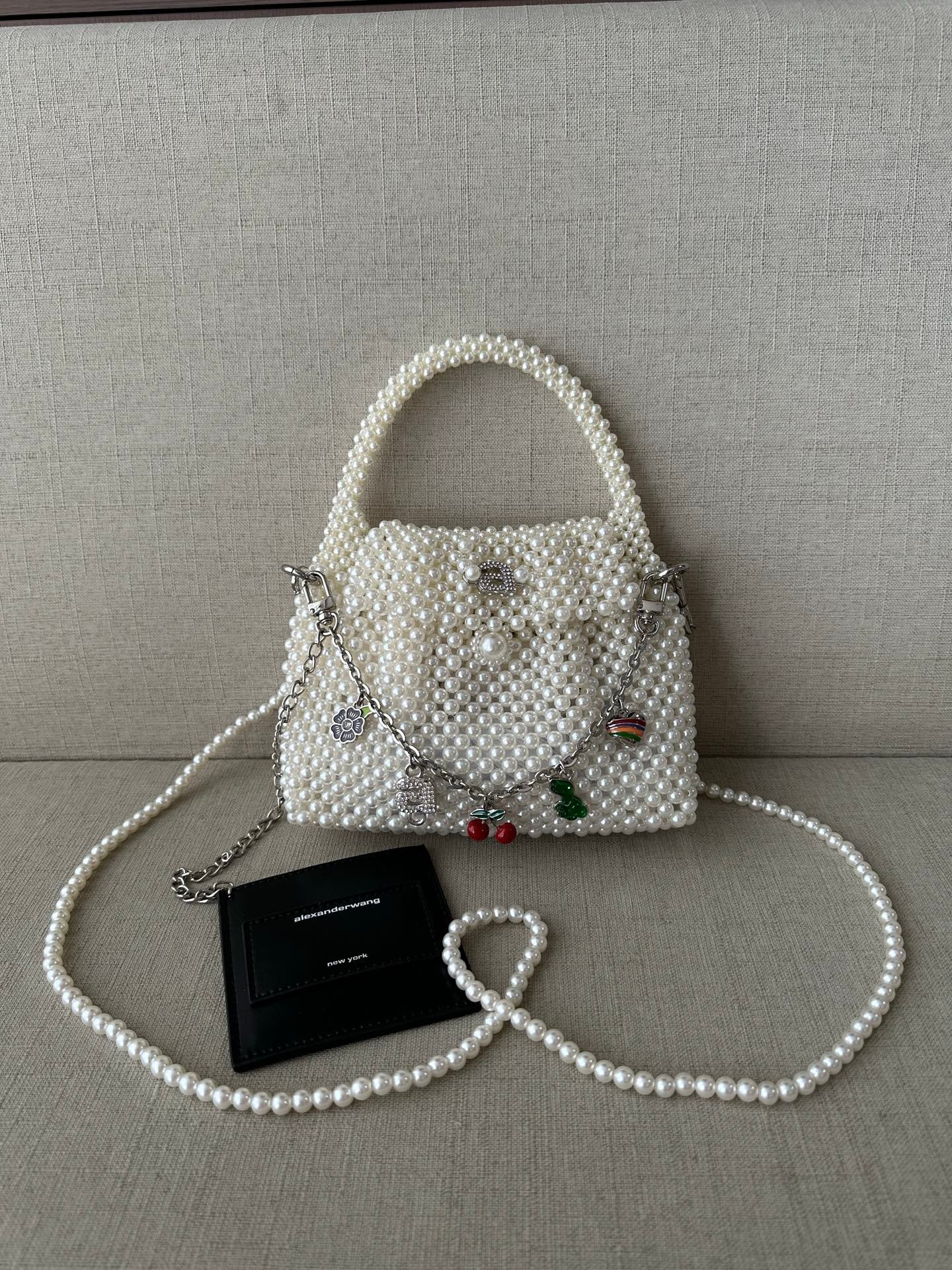 Alexander Wang White Faux Pearl Beaded Handbag, Charm Chain Luxury Crossbody Bag