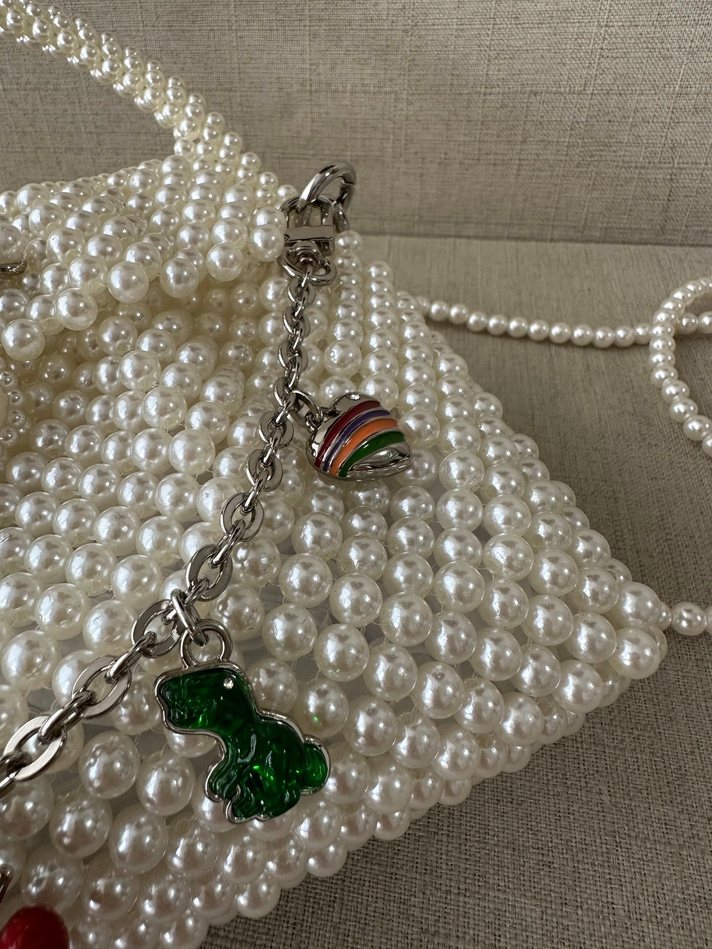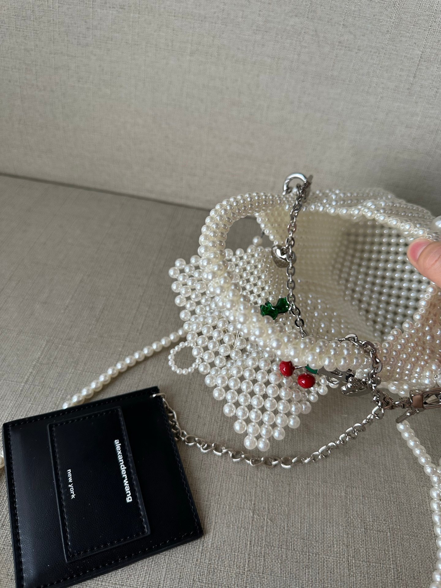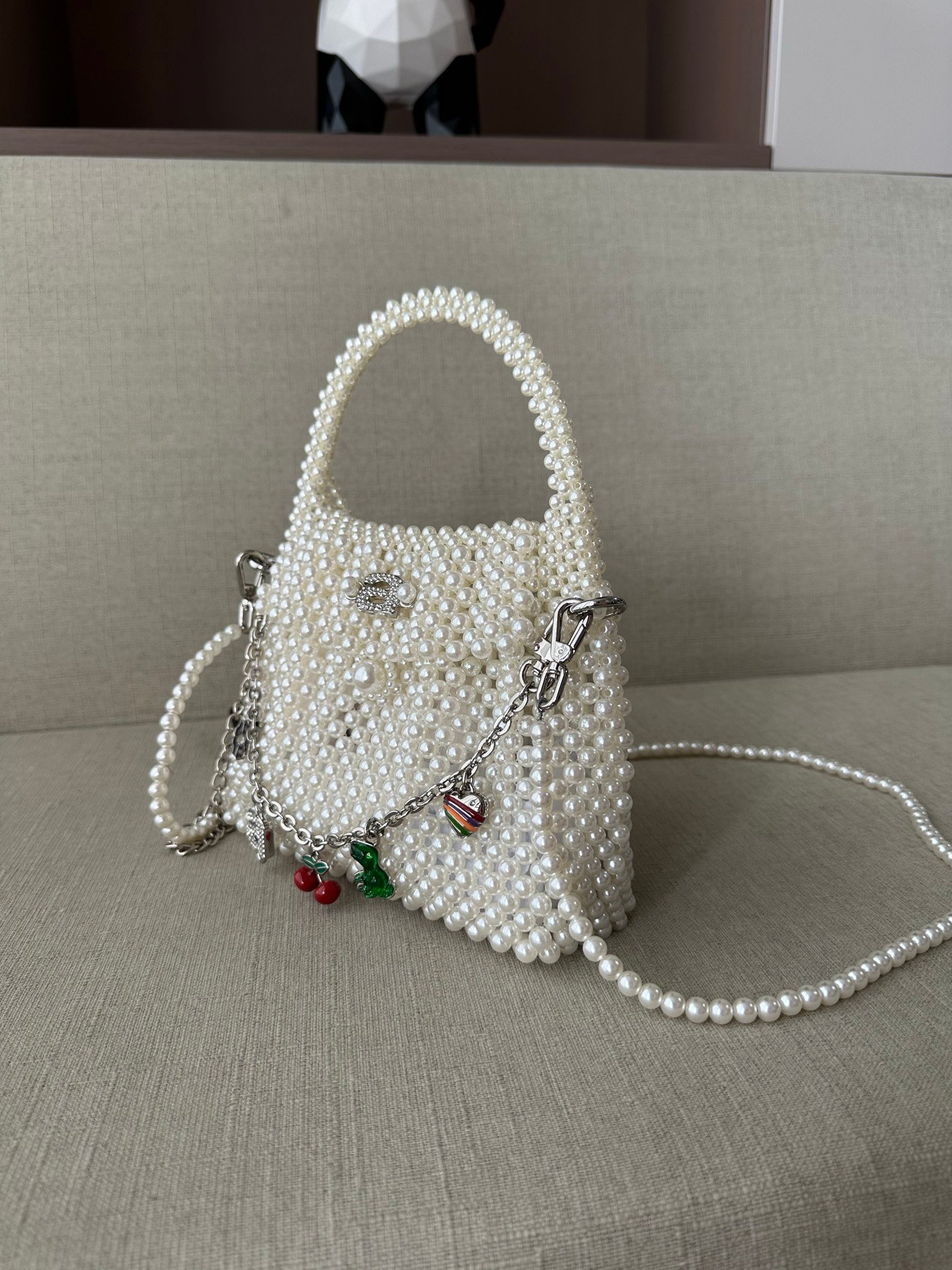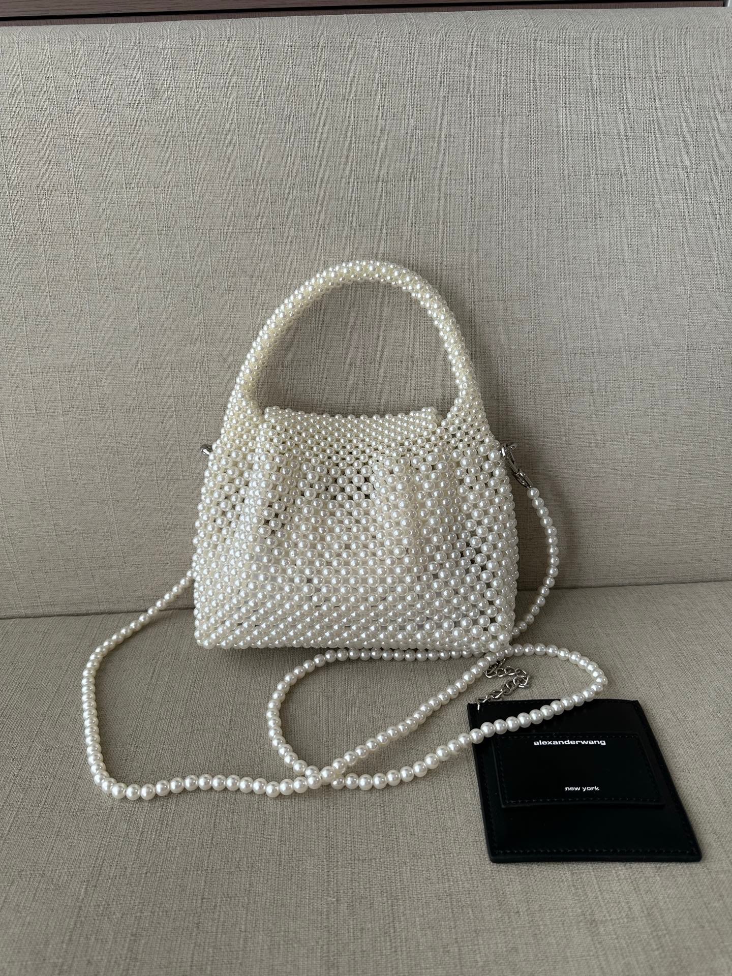 This handbag embodies Alexander Wang’s bold, modern luxury aesthetic, featuring a full faux pearl beaded body with a structured bucket silhouette. The intricate pearl craftsmanship and playful charm chain create a head-turning, glamorous look, perfect for evening events, parties, and stylish daily outings.