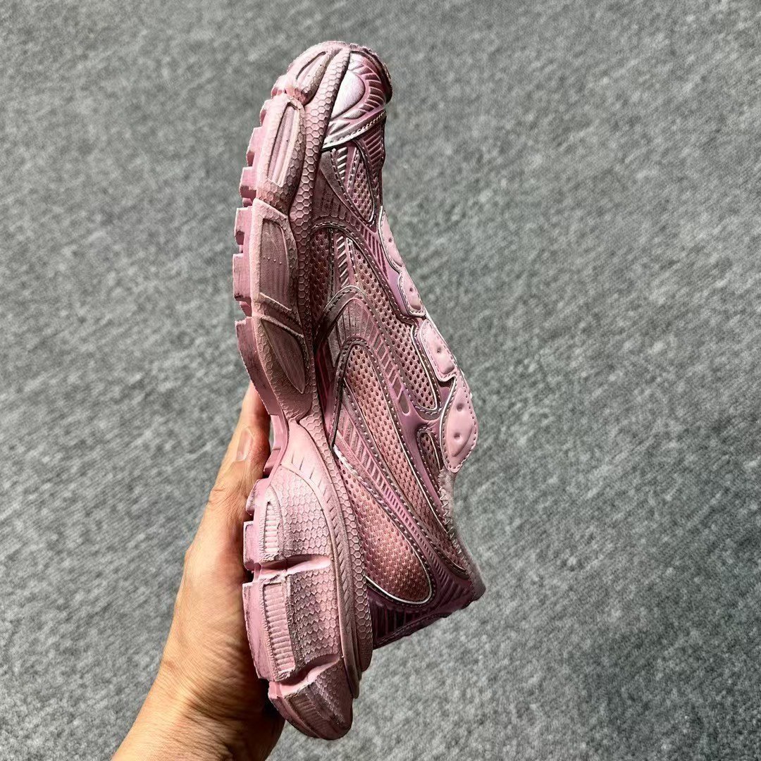 These sneakers embody Balenciaga’s iconic avant-garde streetwear design, featuring the signature 3XL silhouette with a layered pink mesh and synthetic leather upper paired with metallic silver accents. The exaggerated, sculpted profile and intentional distressed finish create a bold, worn-in look that defines modern luxury sneaker style.
