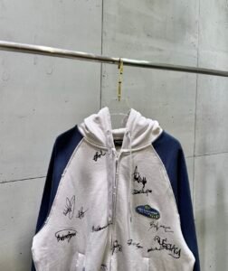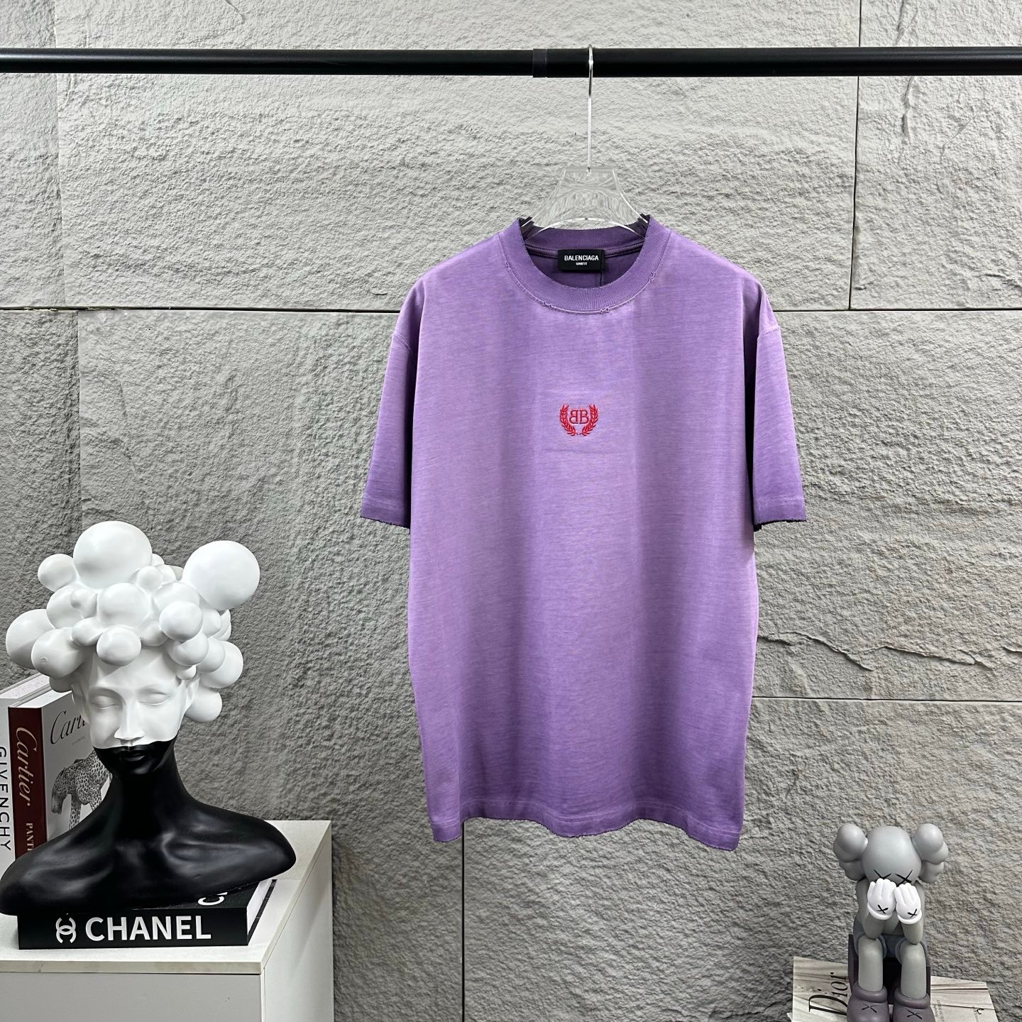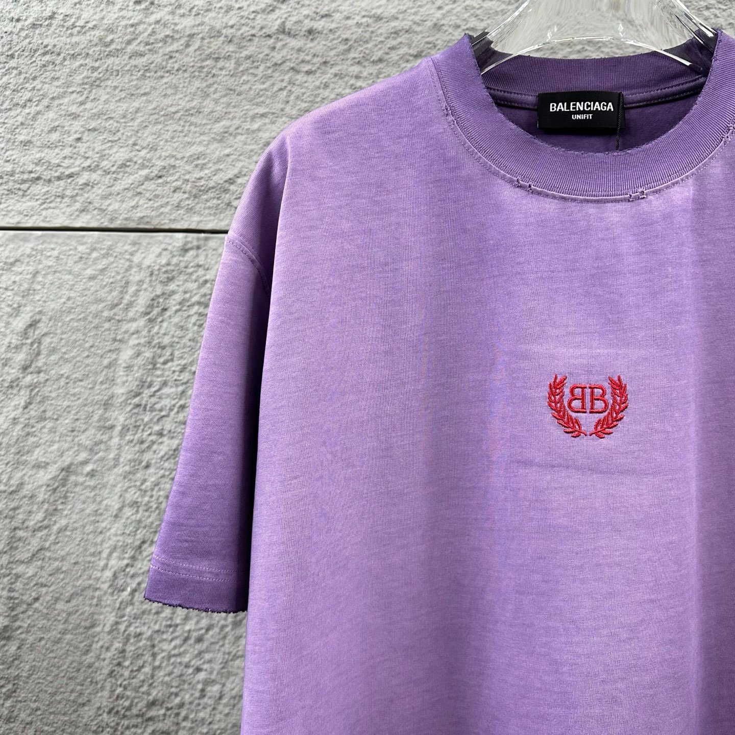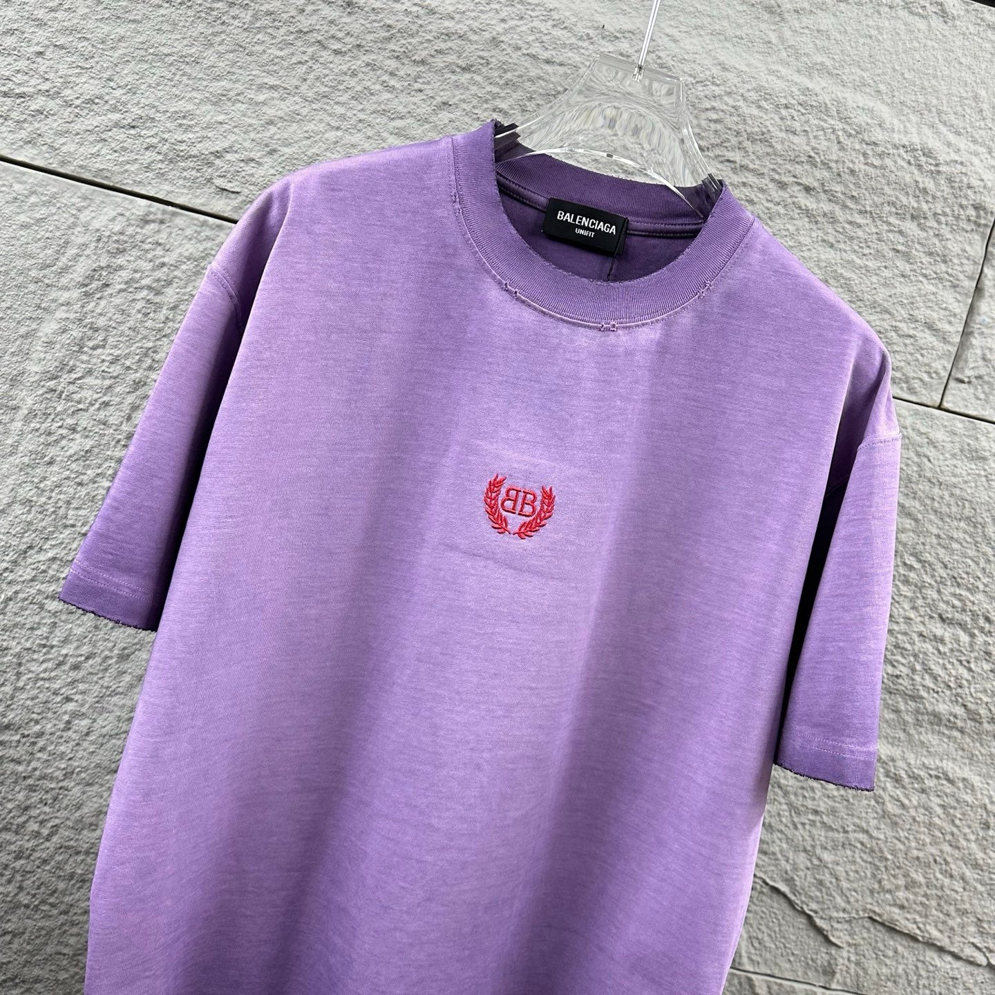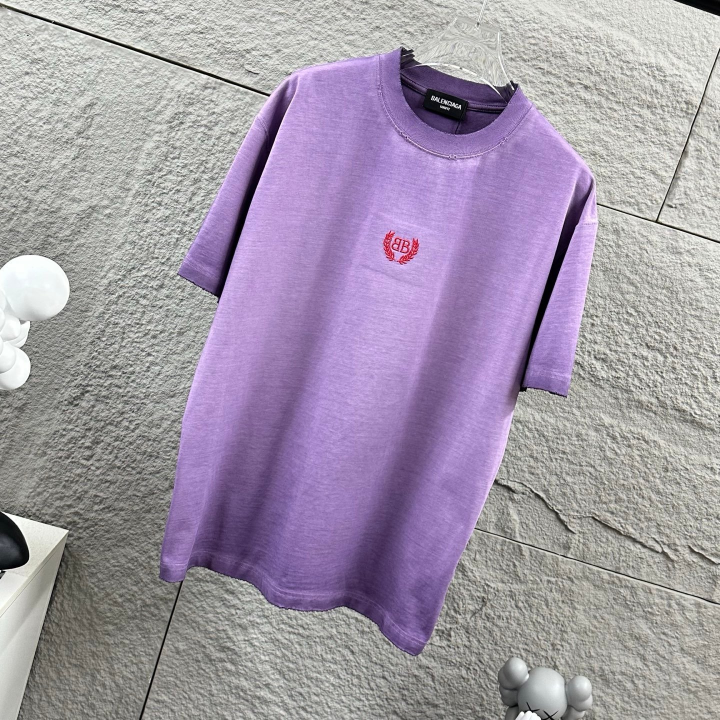- Balenciaga BB Laurel Wreath Embroidery – Features the iconic red BB monogram encircled by laurel wreath embroidery on the left chest. The vibrant red logo against the soft purple washed fabric forms a unique and fashionable contrast, showcasing Balenciaga’s distinctive vintage luxury design.