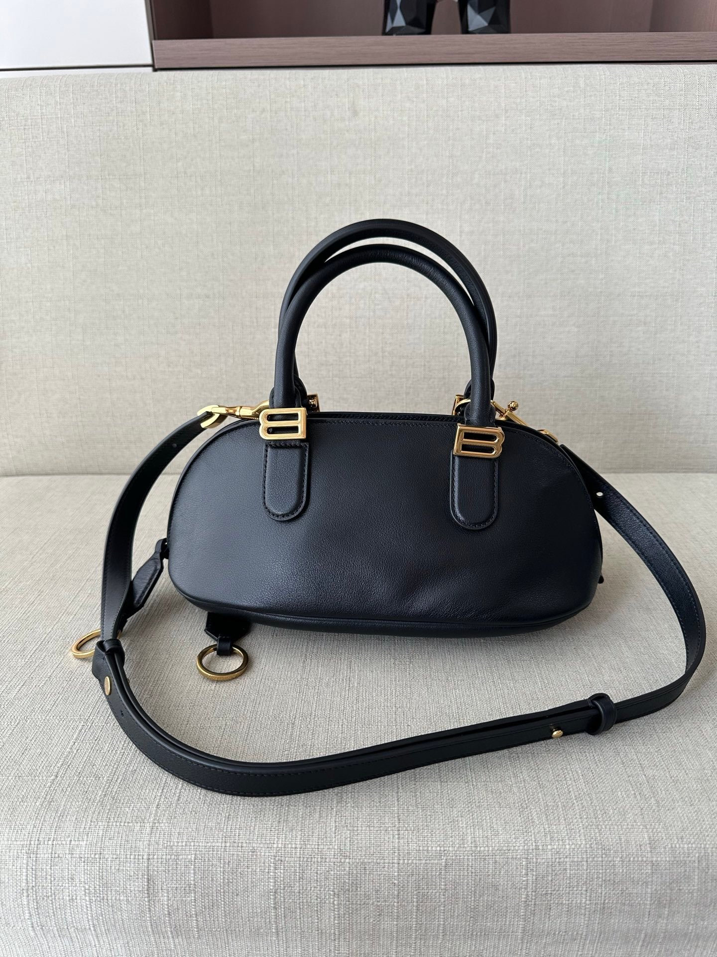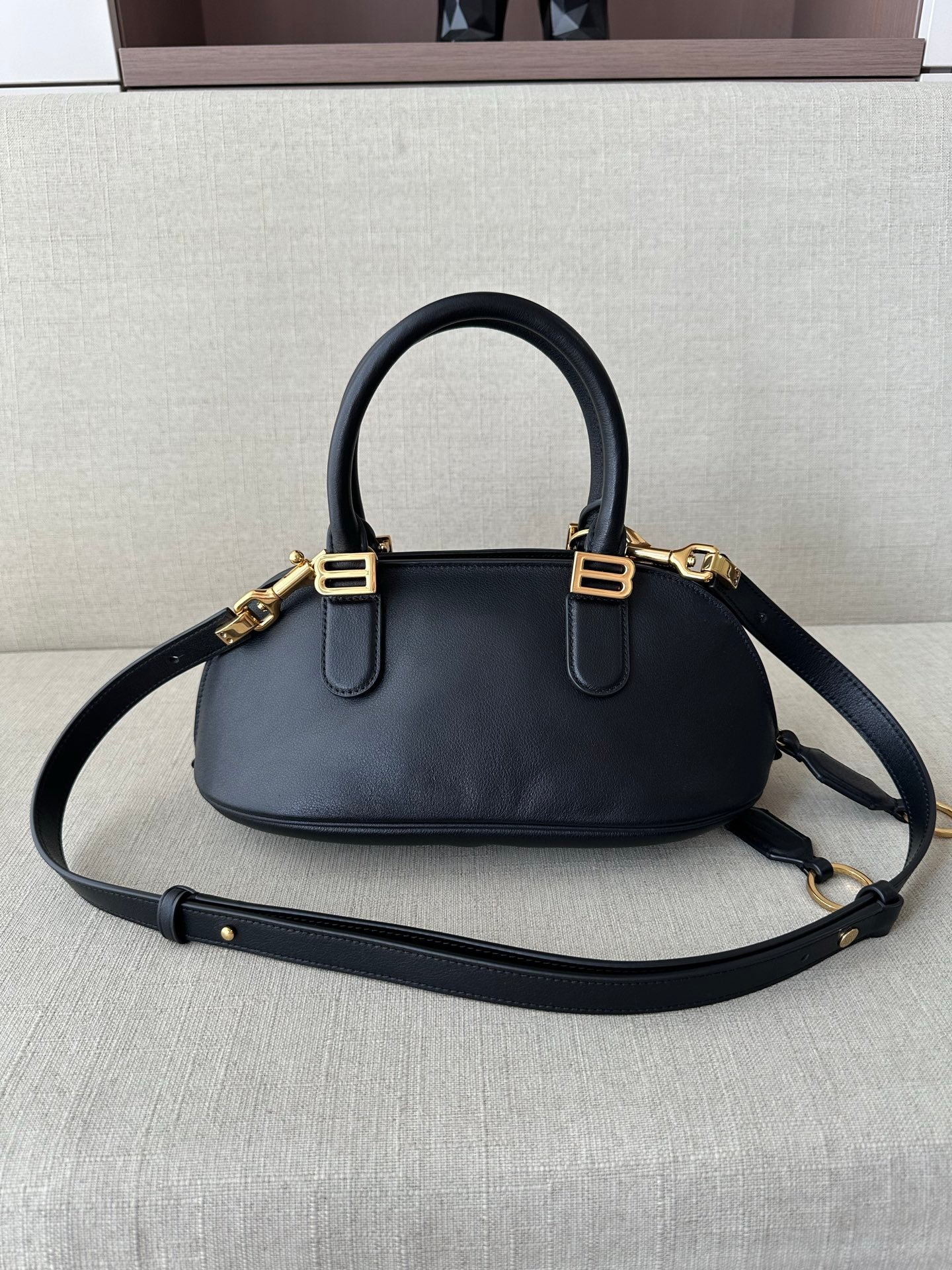 This handbag embodies Balenciaga’s contemporary luxury aesthetic, featuring a sleek black grained calfskin leather body with a structured bowling bag silhouette. The timeless shape blends high-fashion craftsmanship with functional everyday style, perfect for commuting, shopping, and casual outings.
