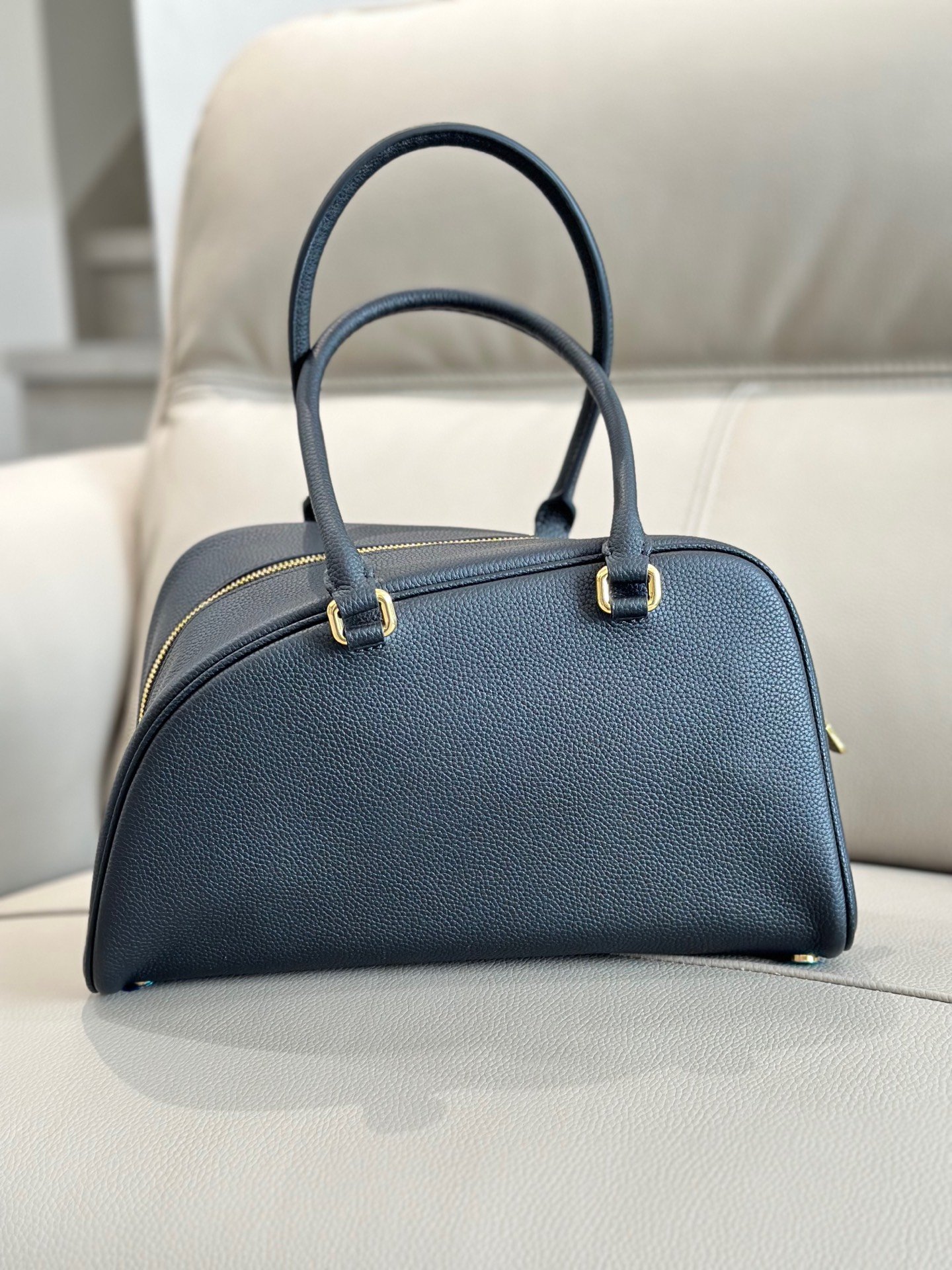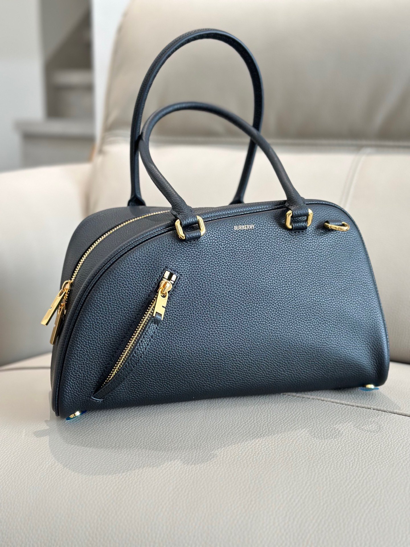 This Boston bag embodies Burberry’s iconic British heritage design, featuring a sleek black grained calfskin leather body with a structured bowling bag silhouette. The timeless shape blends high-fashion luxury with functional everyday style, perfect for commuting, weekend getaways, and casual outings.
