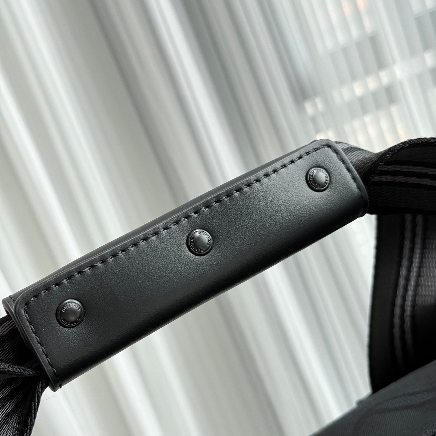 Crafted from durable black nylon jacquard fabric with a raised monogram pattern, paired with smooth black leather trim and reinforced webbing straps. The lightweight yet tear-resistant material ensures exceptional durability for long-term travel use.