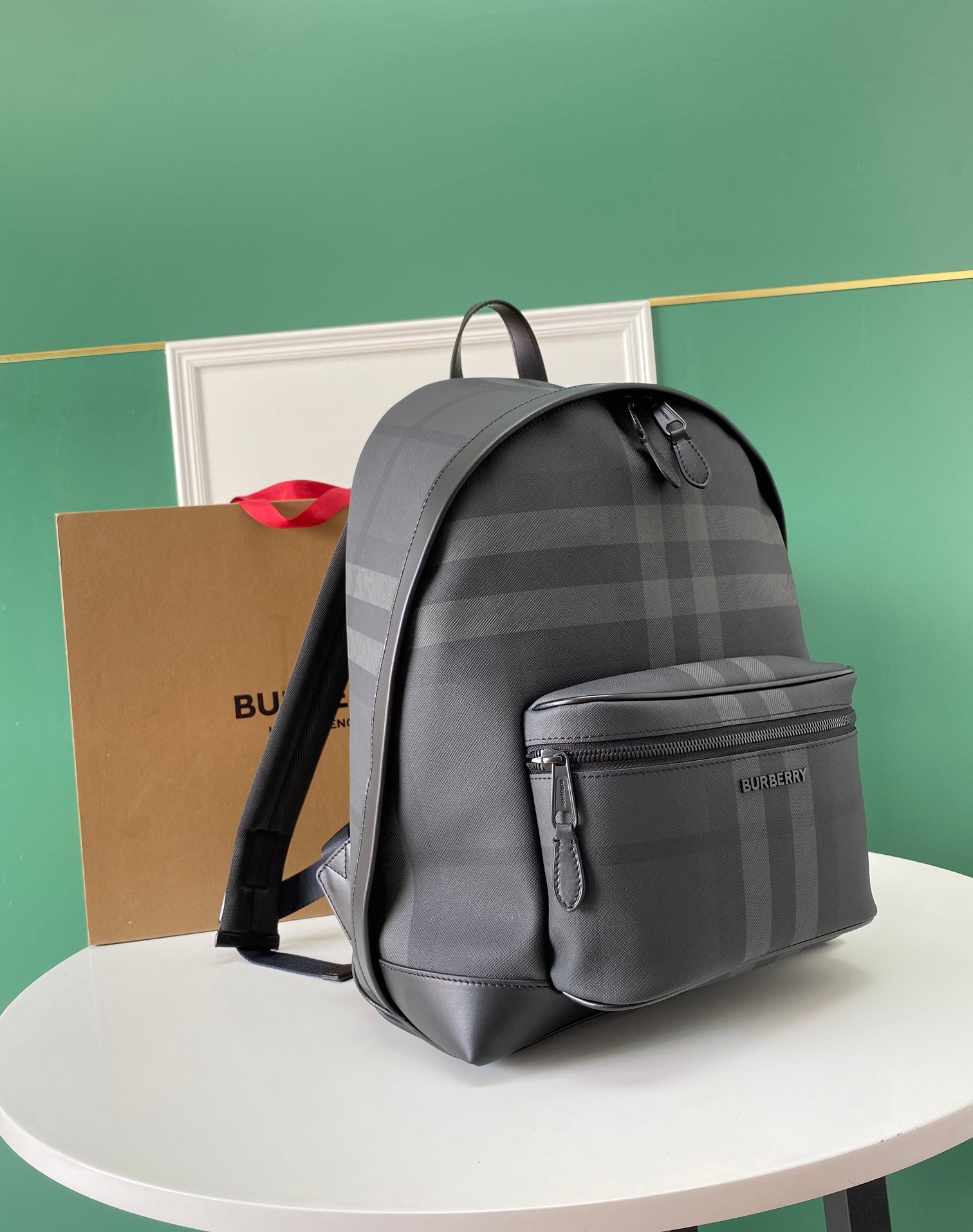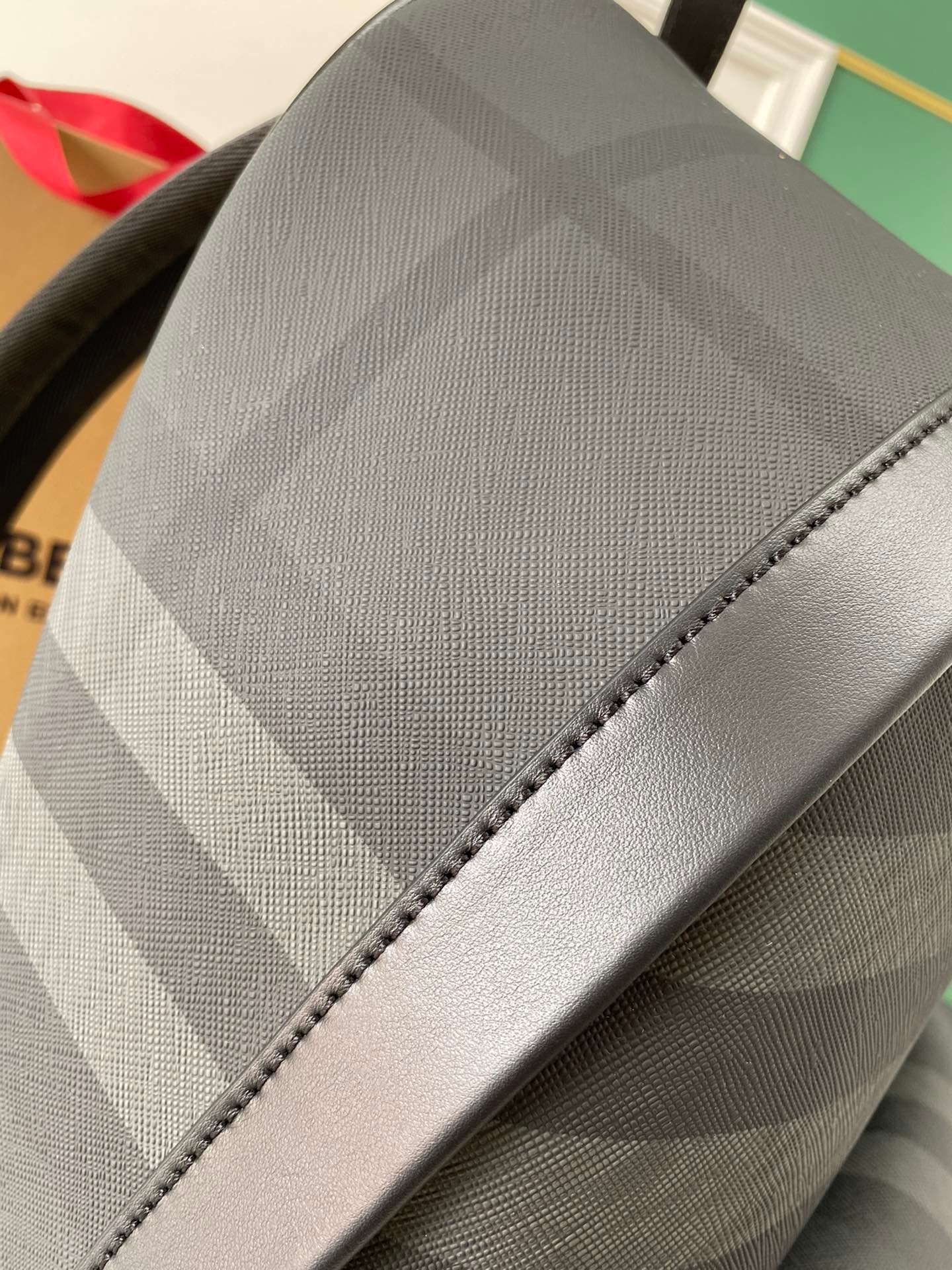 This backpack embodies Burberry’s contemporary British luxury, featuring a sleek charcoal gray dark check coated canvas body with a classic rounded silhouette. The understated check pattern blends modern street style with functional everyday use, perfect for commuting, travel, school, and casual outings.
