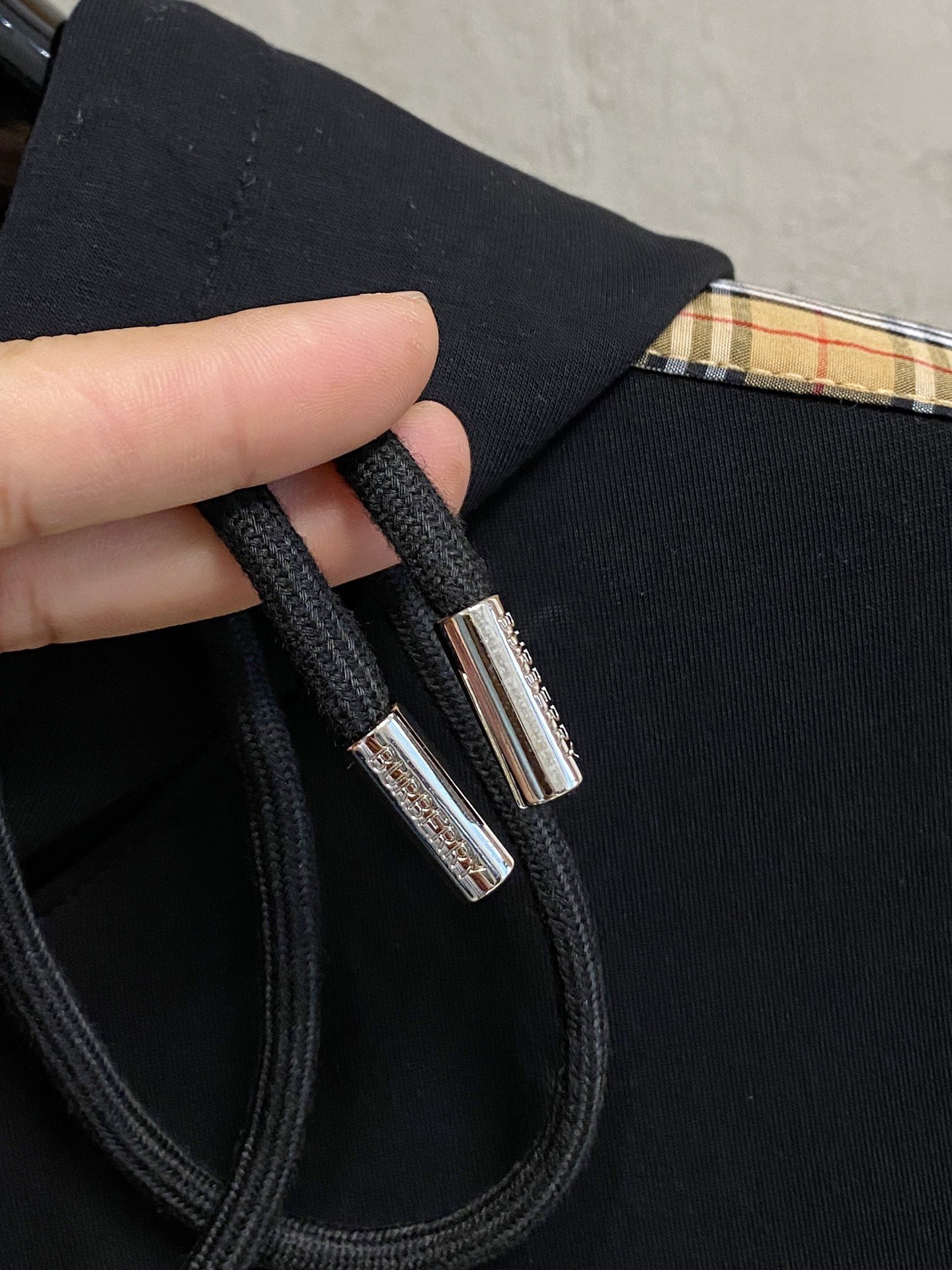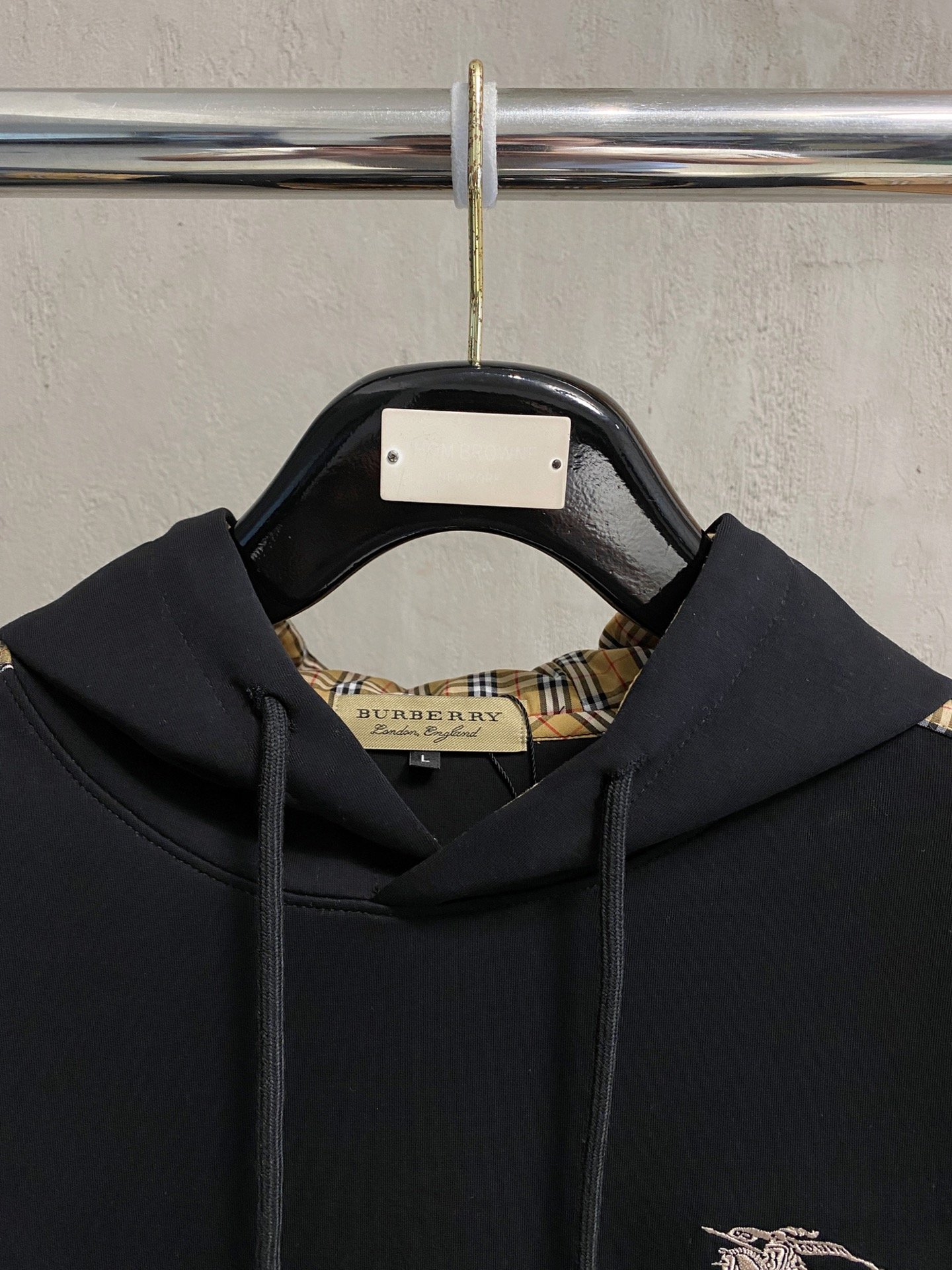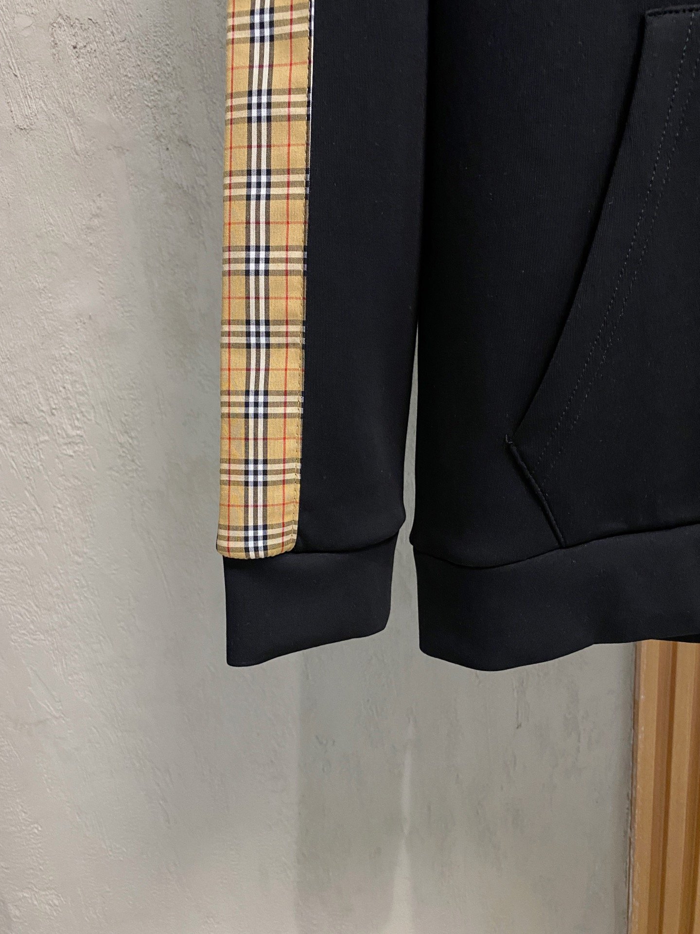 - Vintage Check Side Panel Design – Adopts the brand’s signature vintage check pattern on the shoulder and sleeve side panels, creating a striking contrast with the sleek black body. This classic British check element adds a distinctive fashion touch to the minimalist hoodie, making it a timeless luxury staple.