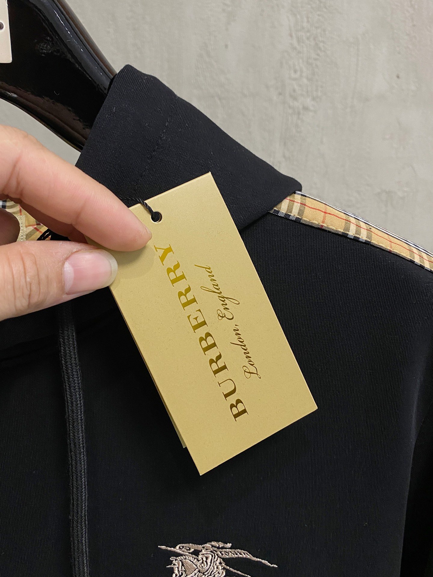 - Burberry Equestrian Knight Embroidery – Features the iconic Burberry equestrian knight logo with brand lettering embroidery on the chest. The exquisite white contrast stitching against the black body highlights the brand’s classic heritage and sophisticated craftsmanship, presenting authentic luxury details.