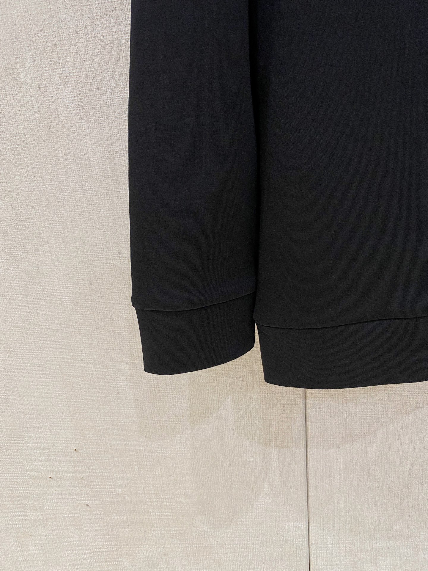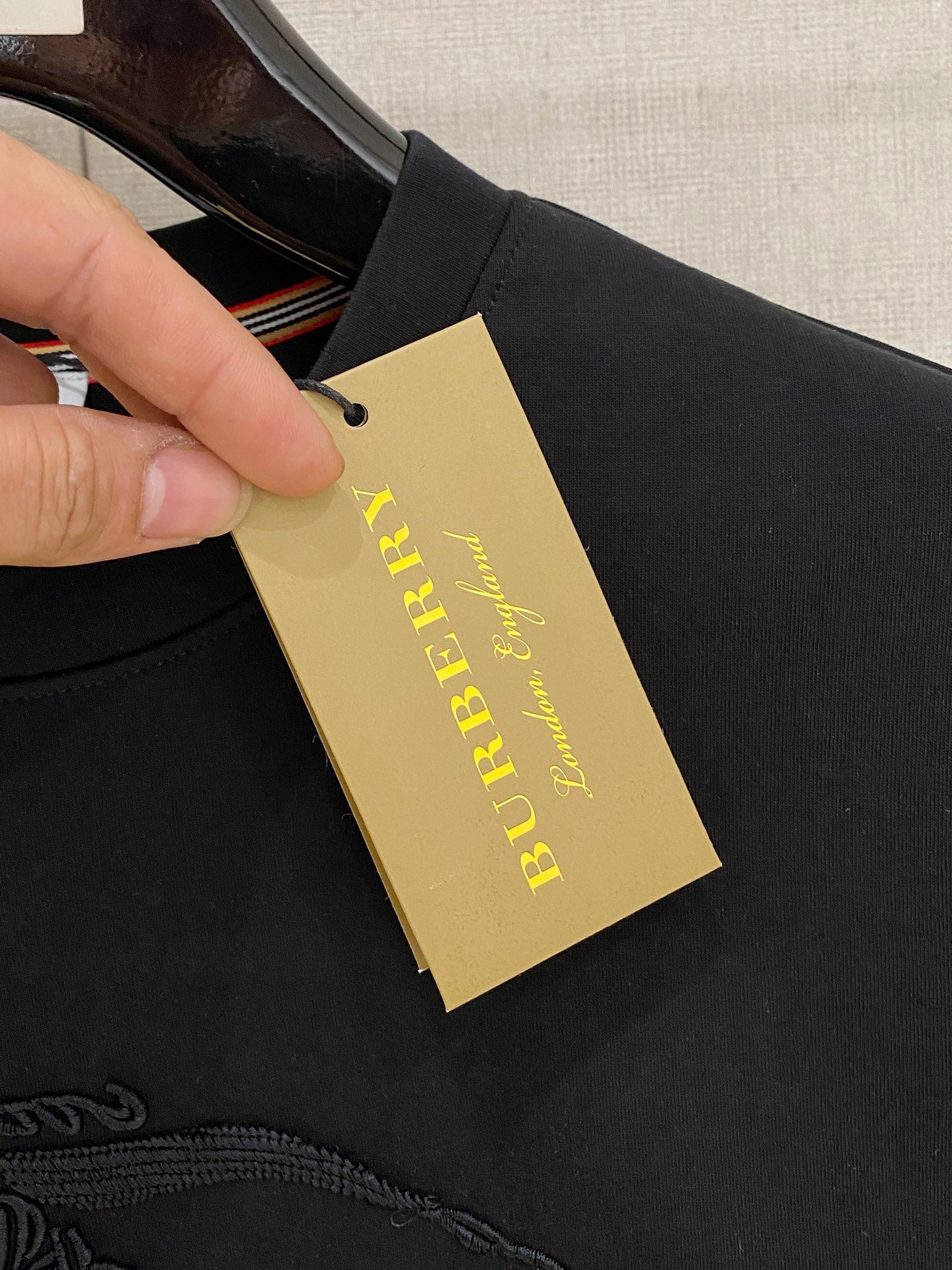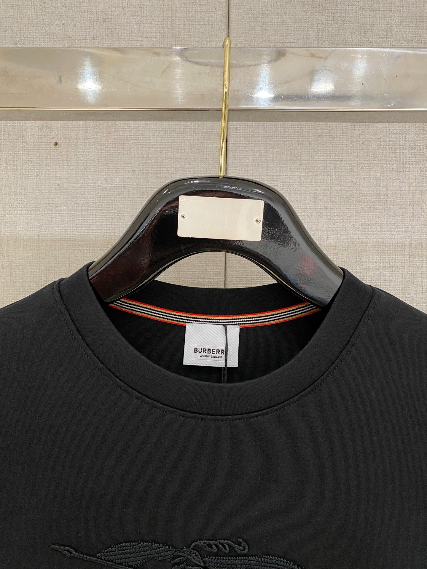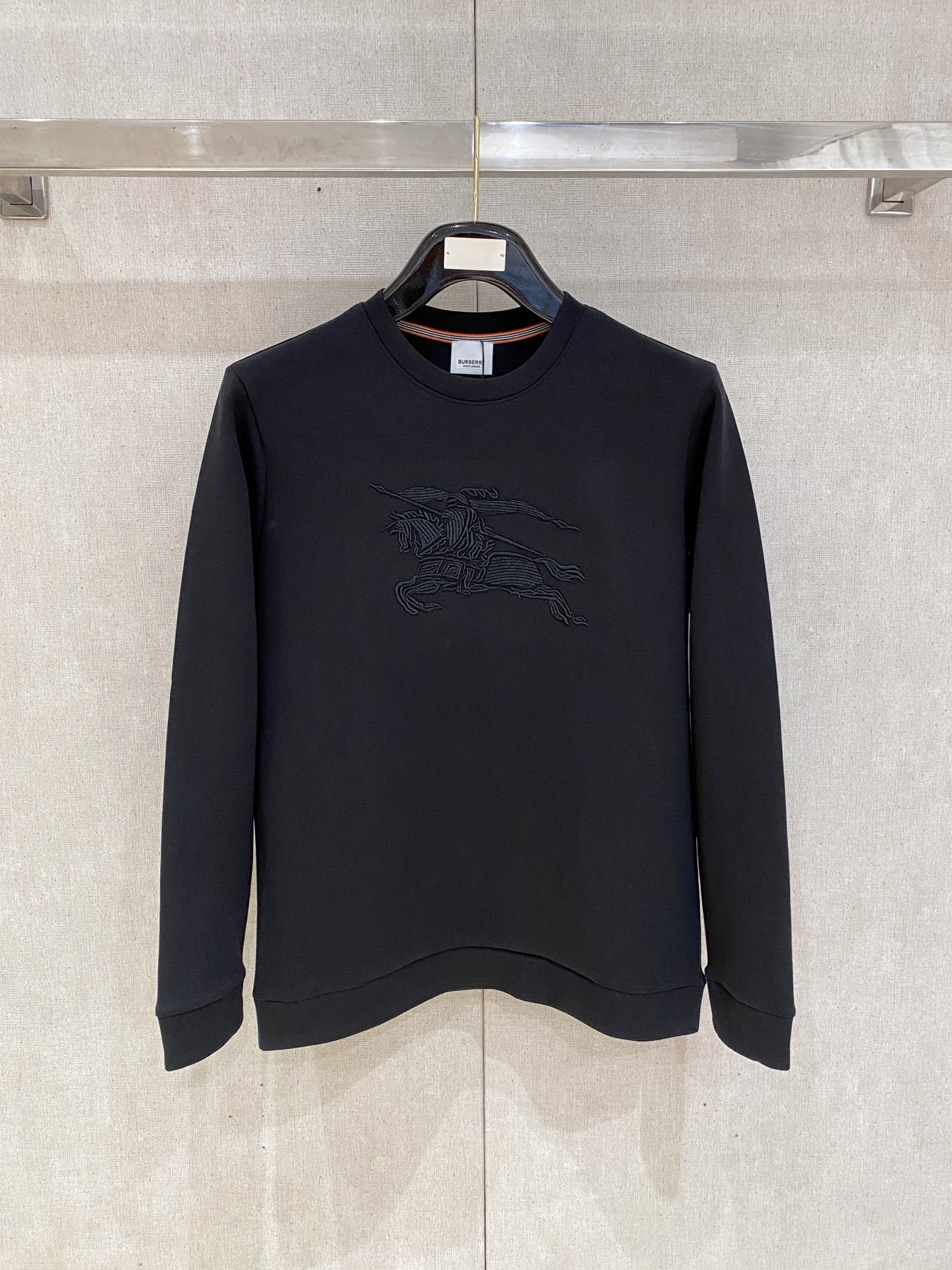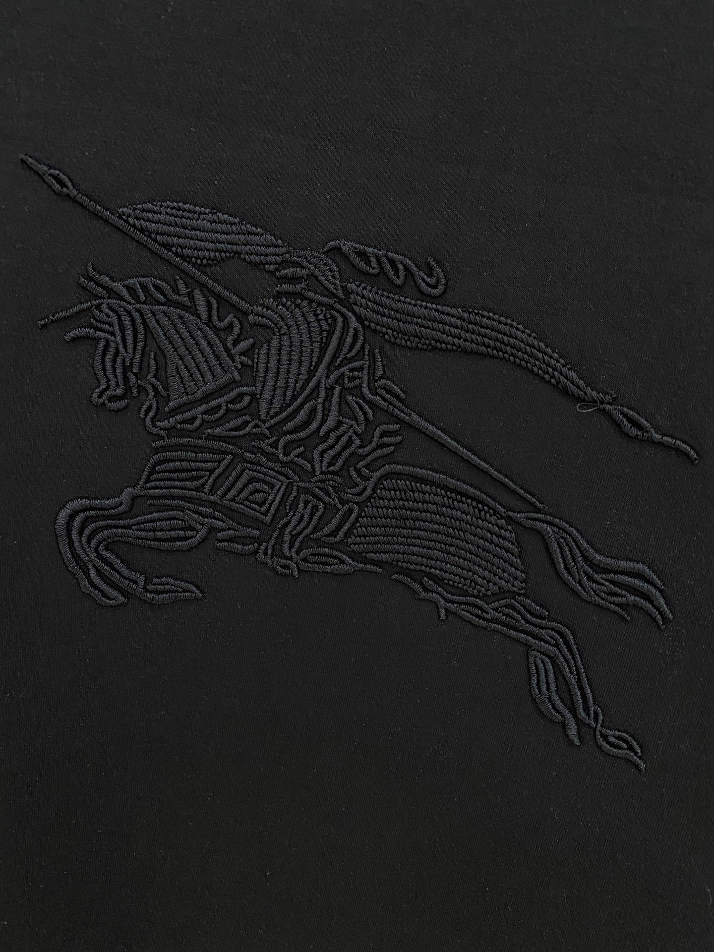 - Burberry Large Tone-on-Tone Equestrian Knight Embroidery – Features a prominent large-scale Burberry equestrian knight logo with exquisite tone-on-tone black 3D embroidery on the chest. The subtle textured stitching against the solid black fabric presents the brand’s signature understated luxury, highlighting sophisticated craftsmanship.
