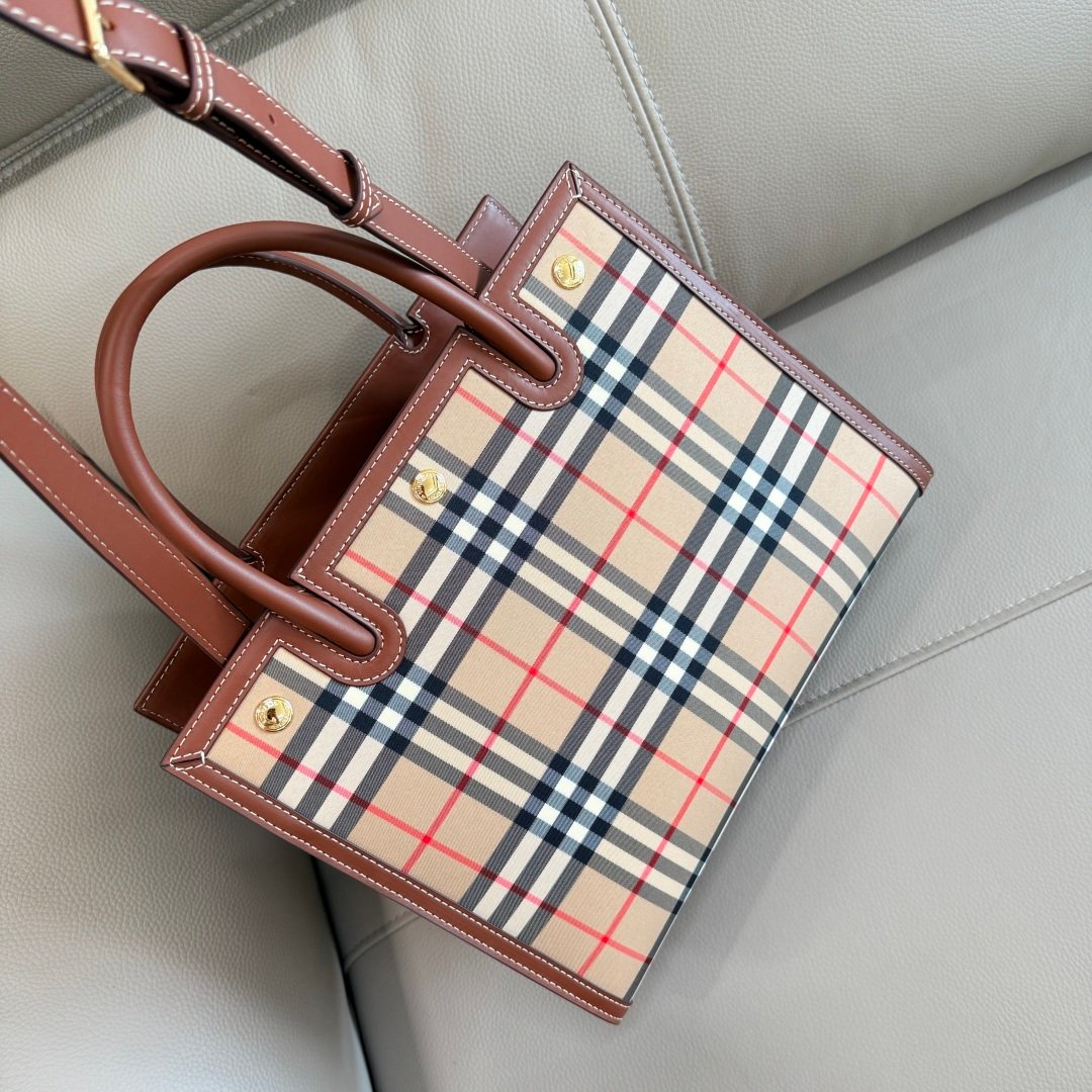 This tote embodies Burberry’s iconic British luxury, featuring the signature Vintage Check canvas paired with premium brown calfskin leather trim. The structured silhouette blends timeless elegance with functional everyday style, perfect for commuting, shopping, and casual outings.