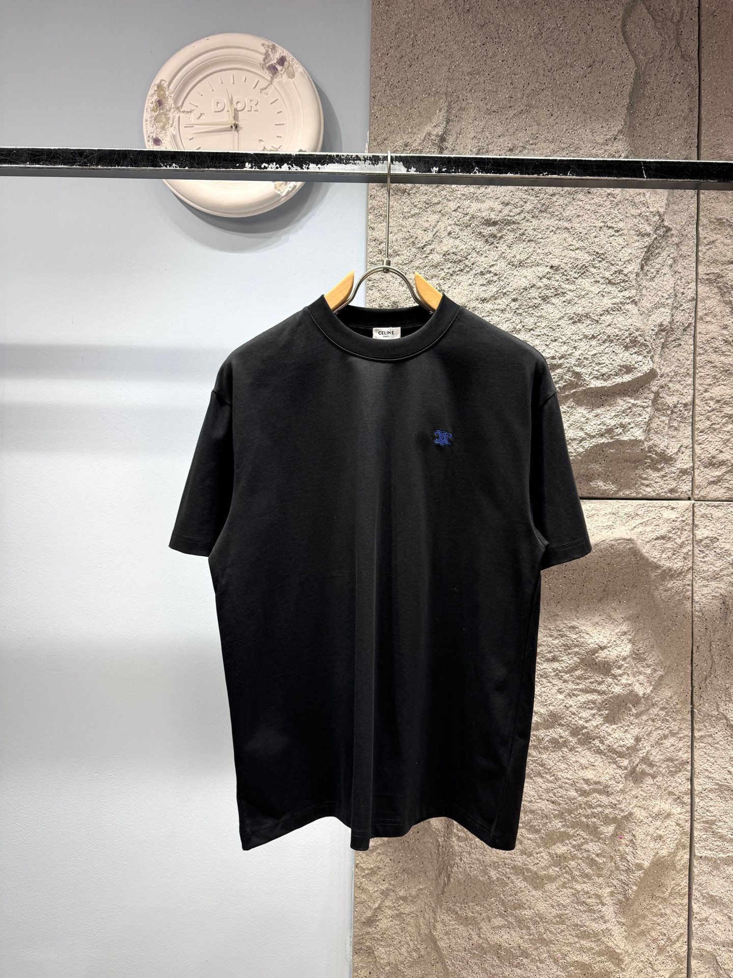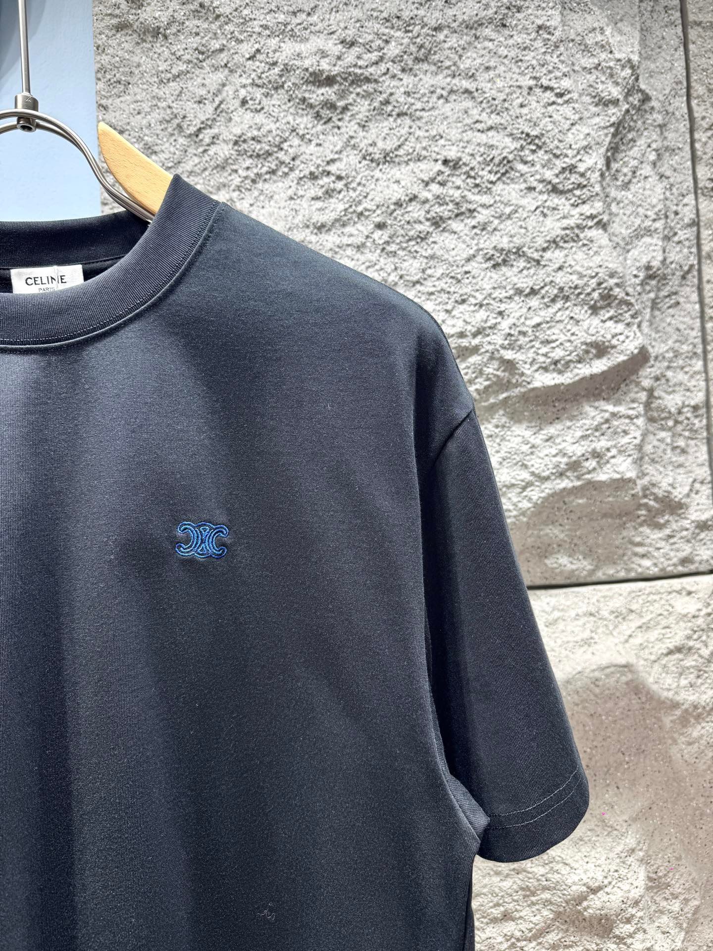 The pure matte black base with eye-catching royal blue mini embroidery logo builds restrained elegant quiet luxury contrast, making this tee an essential versatile wardrobe staple. It pairs effortlessly with jeans, joggers, casual shorts, wide-leg pants and cargo trousers, suitable for both men and women. Whether for daily commuting, casual outings or low-key fashion occasions, this Celine t-shirt elevates every outfit with iconic French minimalist high-fashion temperament.