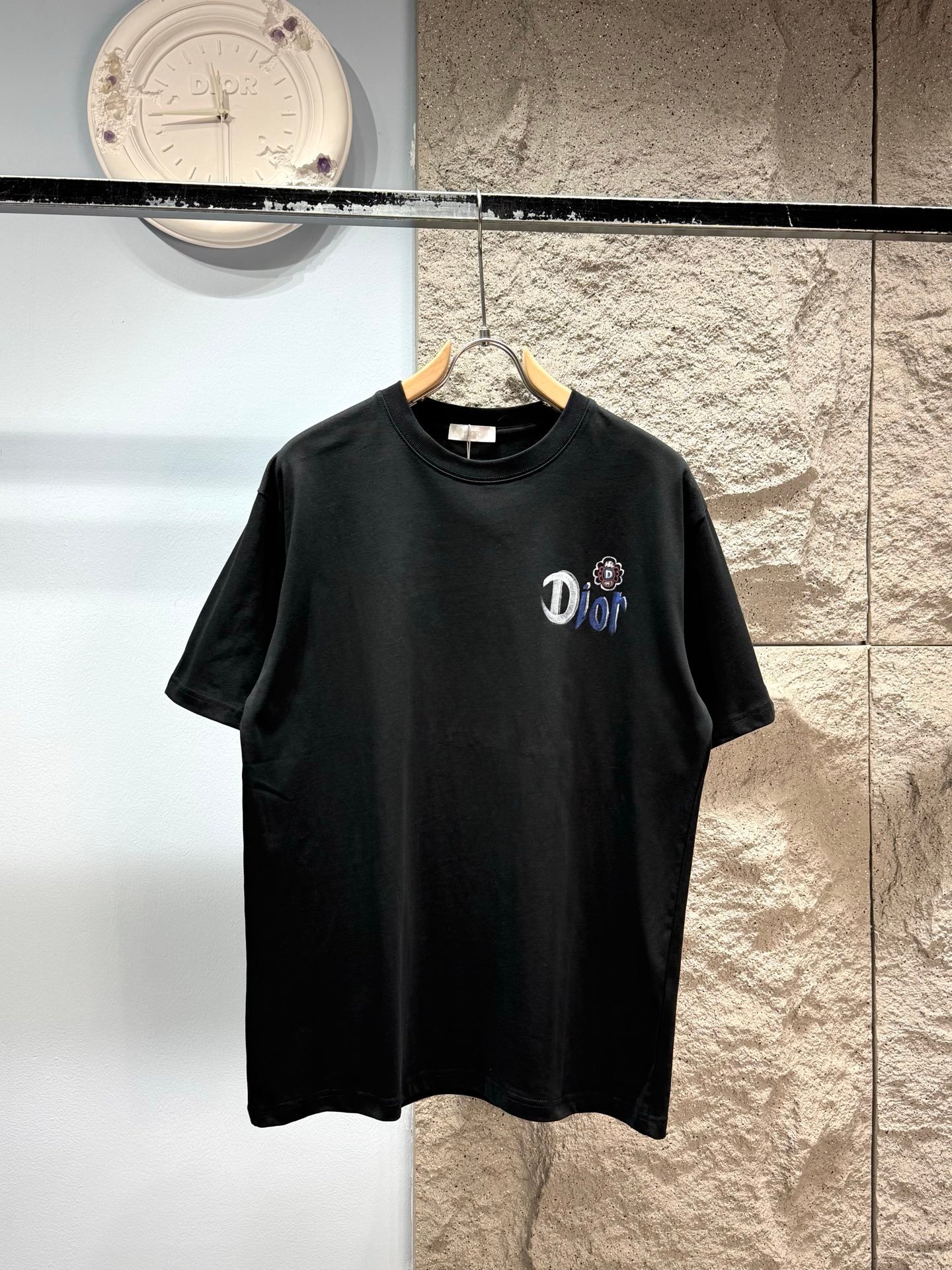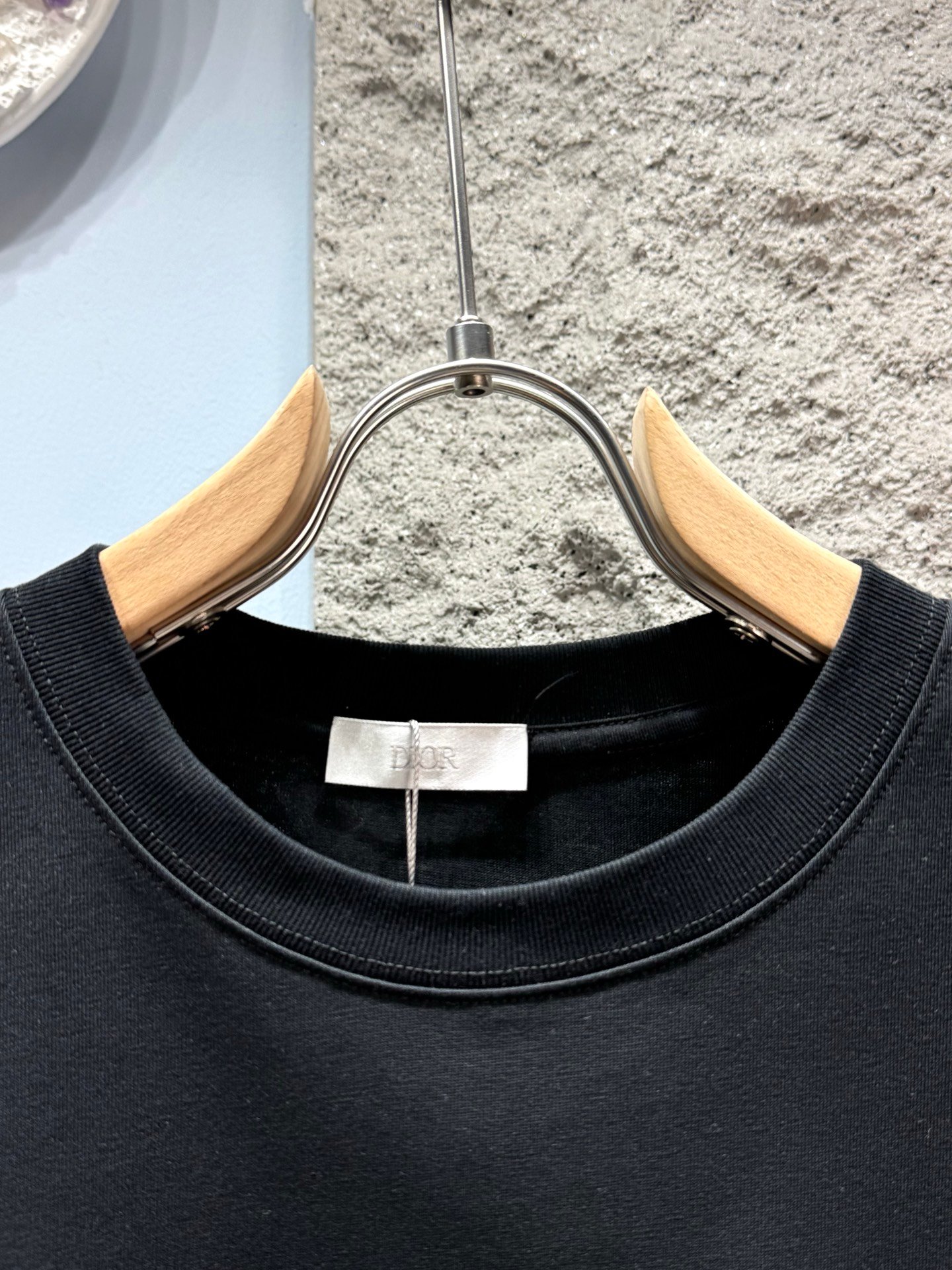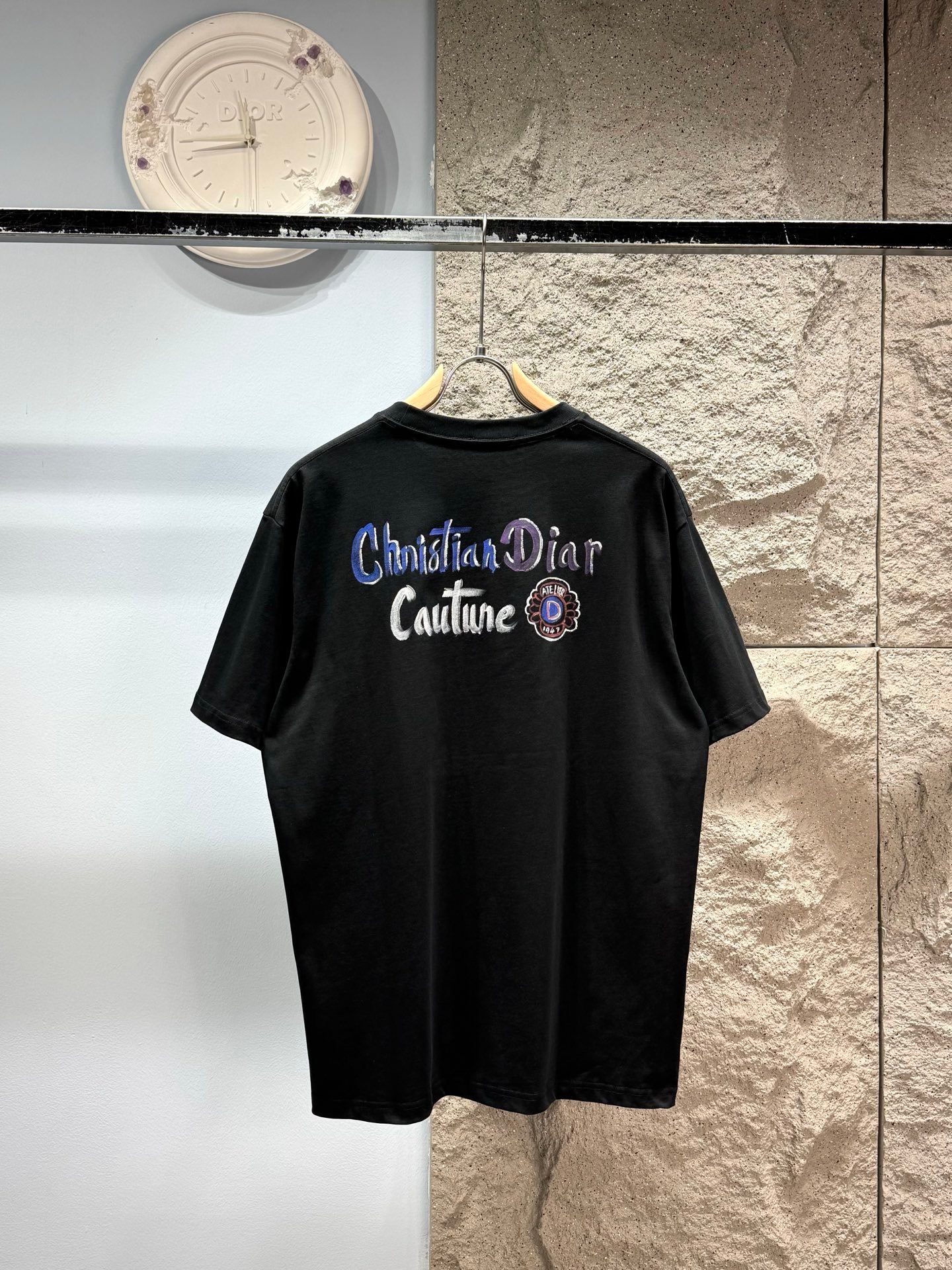 This Dior casual T-shirt is decorated with exquisite gradient color Dior brand letter embroidery and classic evil eye totem embroidery on the chest. It integrates French high fashion luxury aesthetics, mysterious retro totem elements and minimalist daily style, endowing the classic basic tee with distinctive brand recognition and unique fashion artistic temperament.