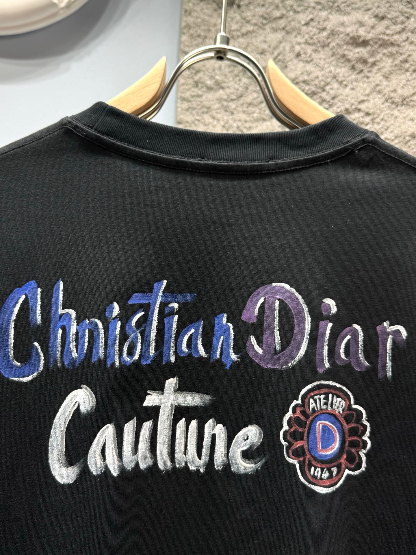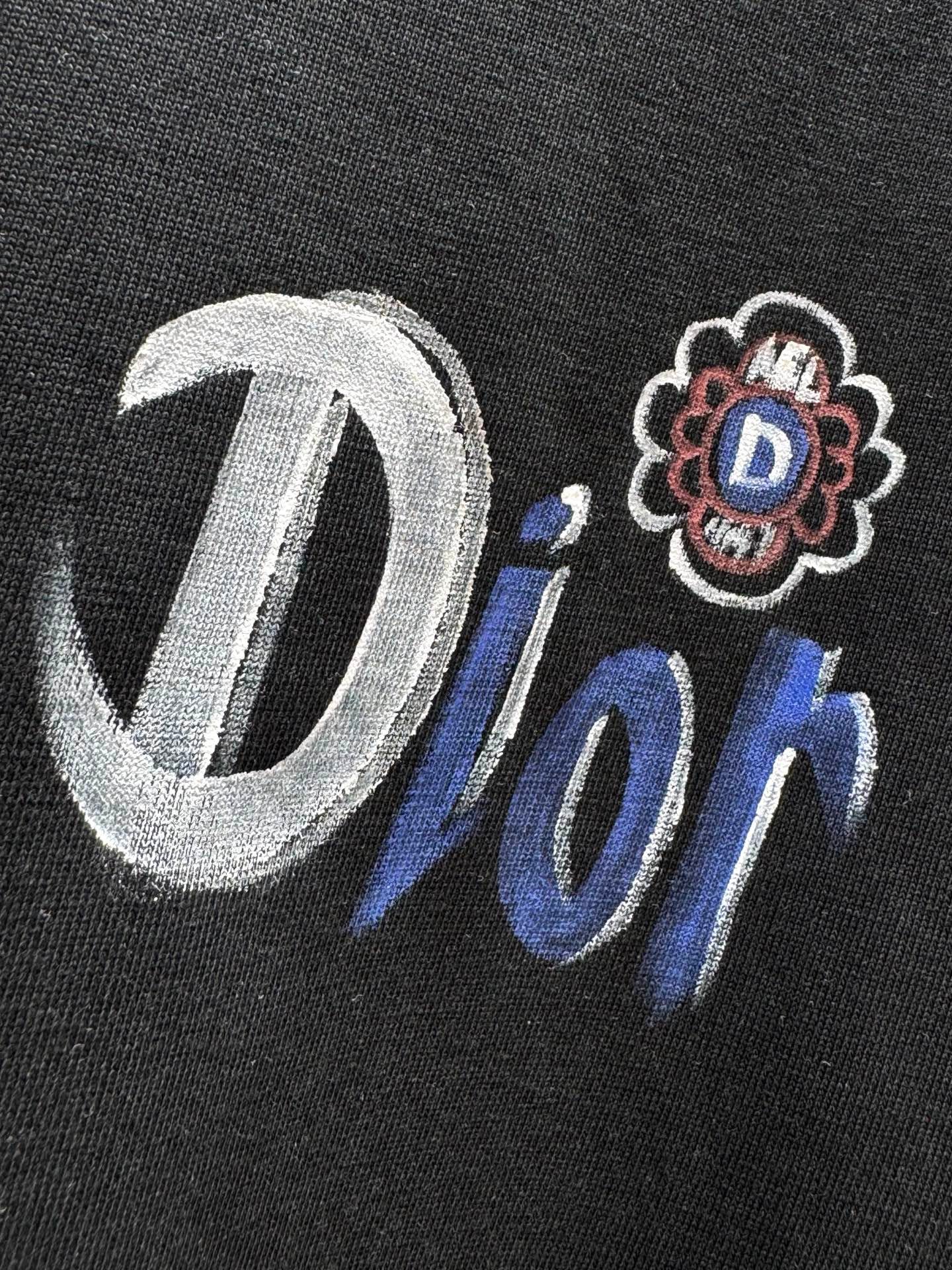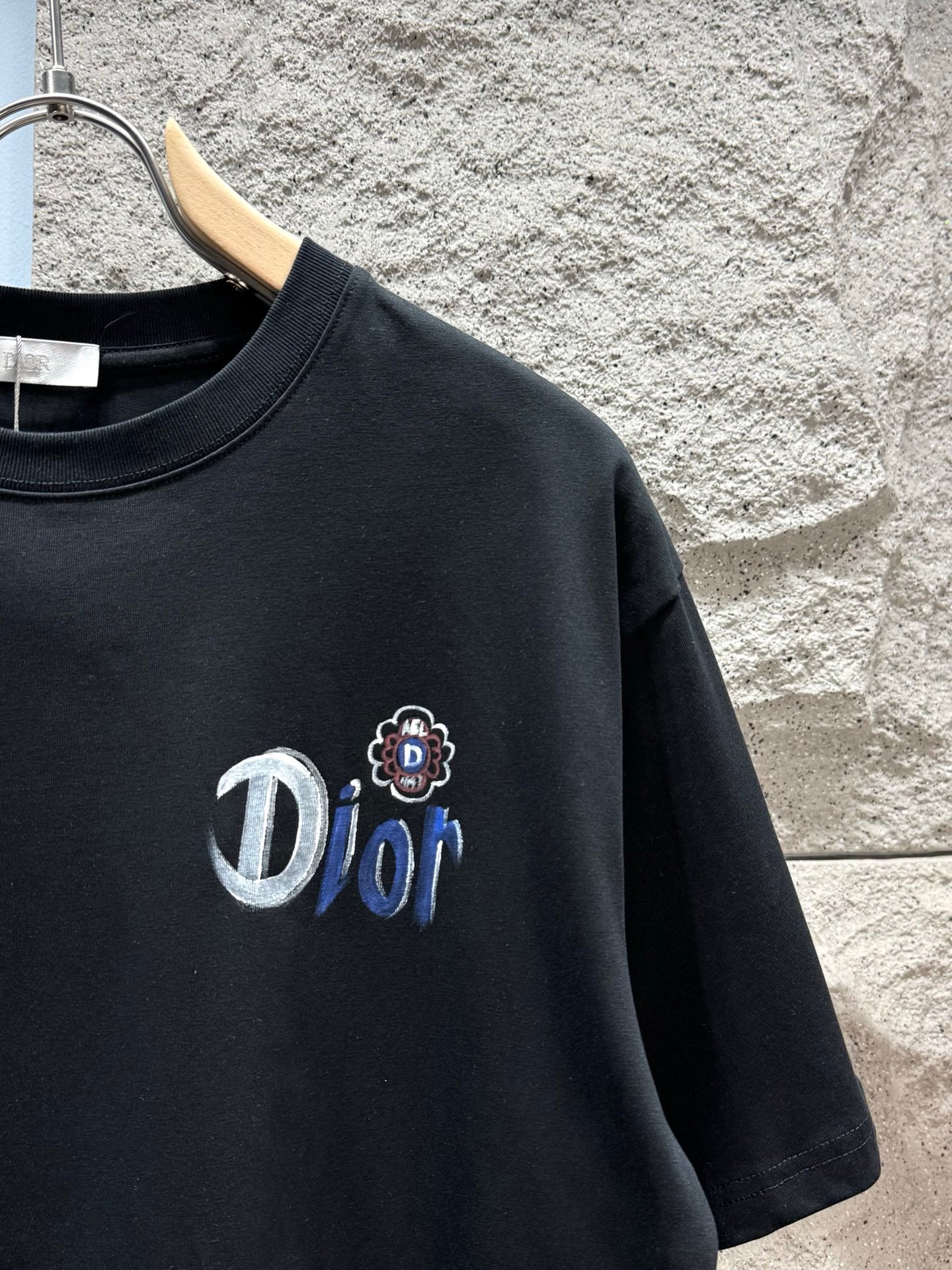 This Dior casual T-shirt is decorated with exquisite gradient color Dior brand letter embroidery and classic evil eye totem embroidery on the chest. It integrates French high fashion luxury aesthetics, mysterious retro totem elements and minimalist daily style, endowing the classic basic tee with distinctive brand recognition and unique fashion artistic temperament.