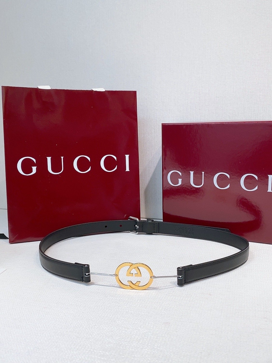 Gucci 400593 Thin Belt for Women, 001 Black/Gold-Silver, Smooth Leather with Interlocking G Buckle (Two-Tone Metal), 2cm Width, Luxury Designer Waist Belt