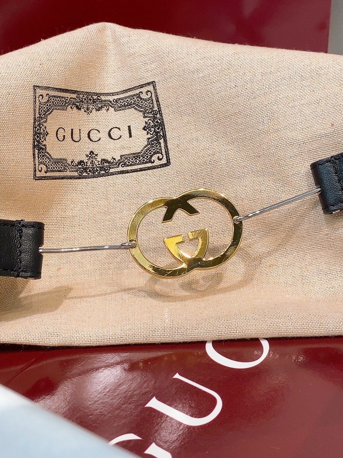 Two-Tone Interlocking G BuckleAdorned with a striking two-tone interlocking G buckle: polished gold-tone G logo paired with silver-tone metal bar and hardware. This modern contrast design reimagines Gucci’s iconic emblem, delivering a sophisticated, eye-catching detail that elevates any look.