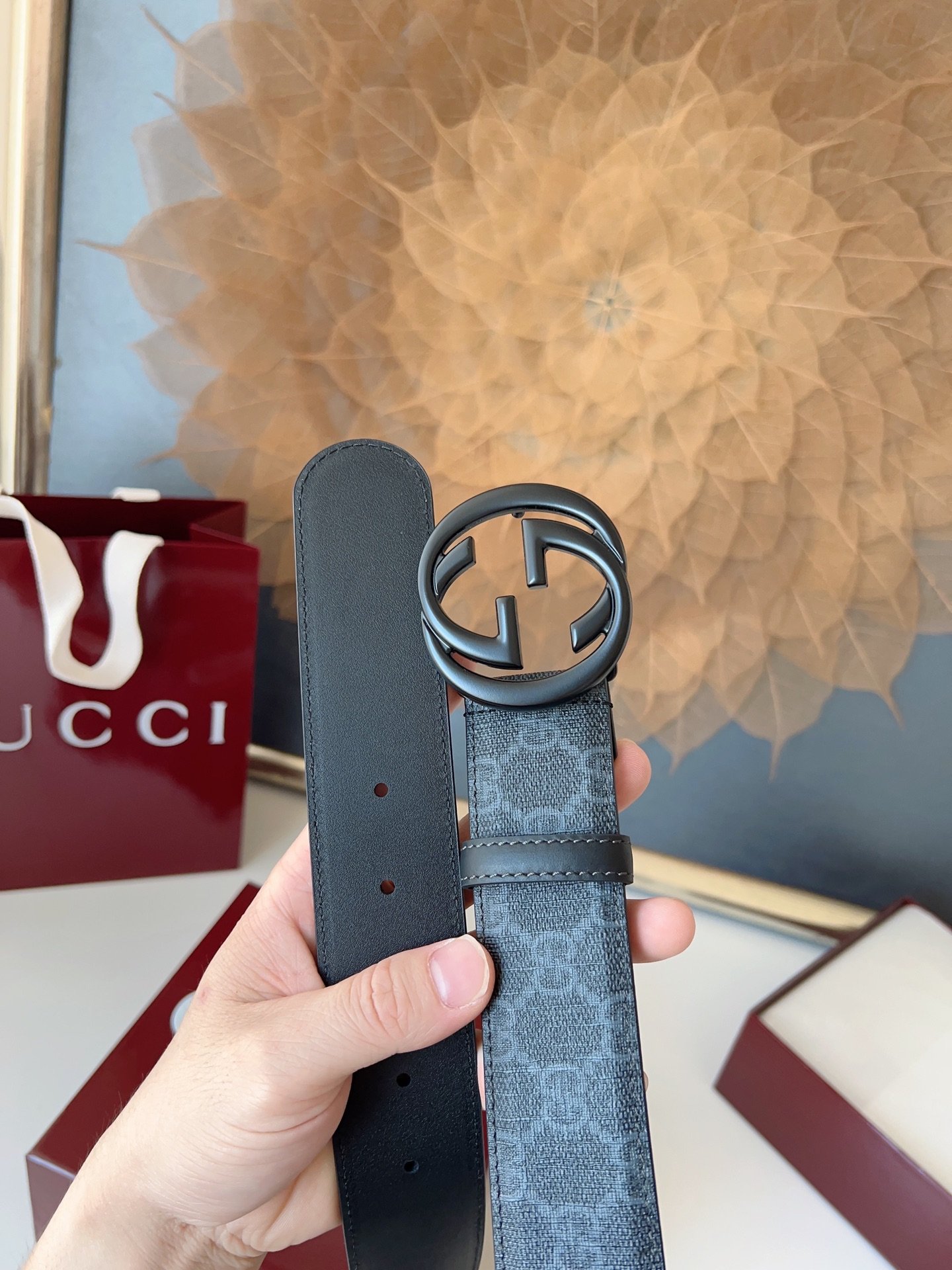 Gucci 774153 Reversible Belt for Men, 002 Dark Grey GG/Black Leather, Signature Monogram Canvas with Matte Black Interlocking G Buckle, 3.6cm Width, Luxury Designer Belt