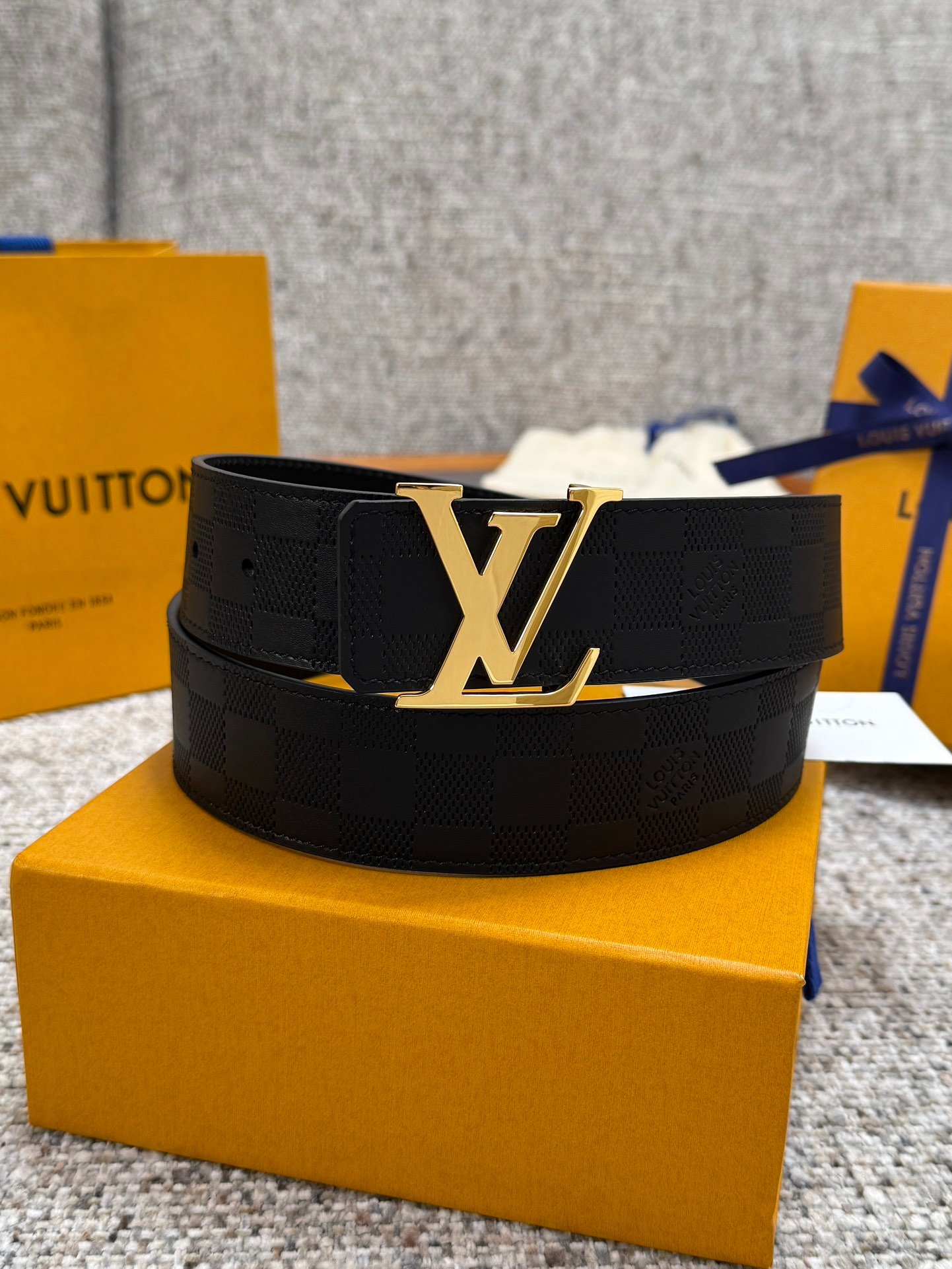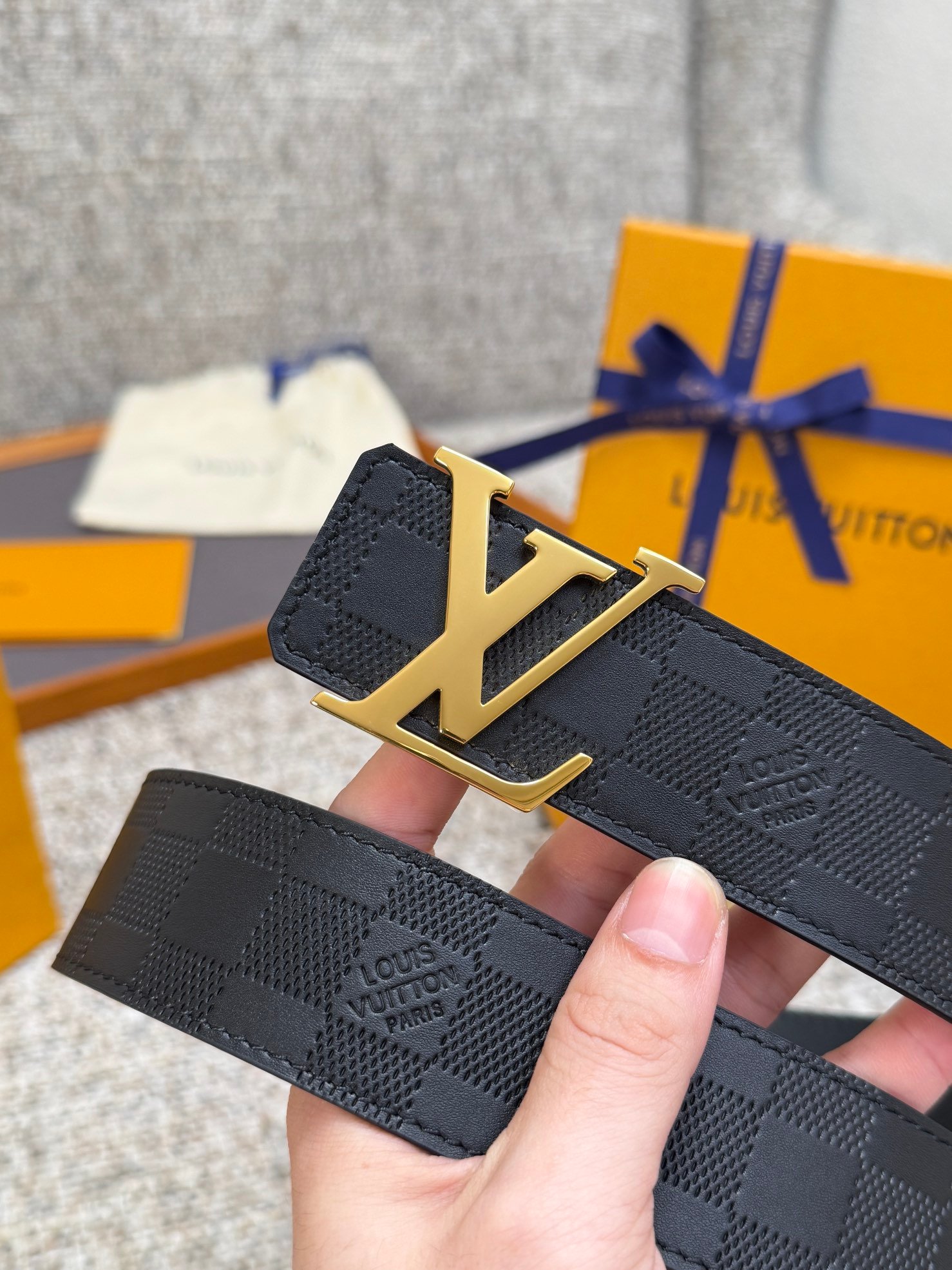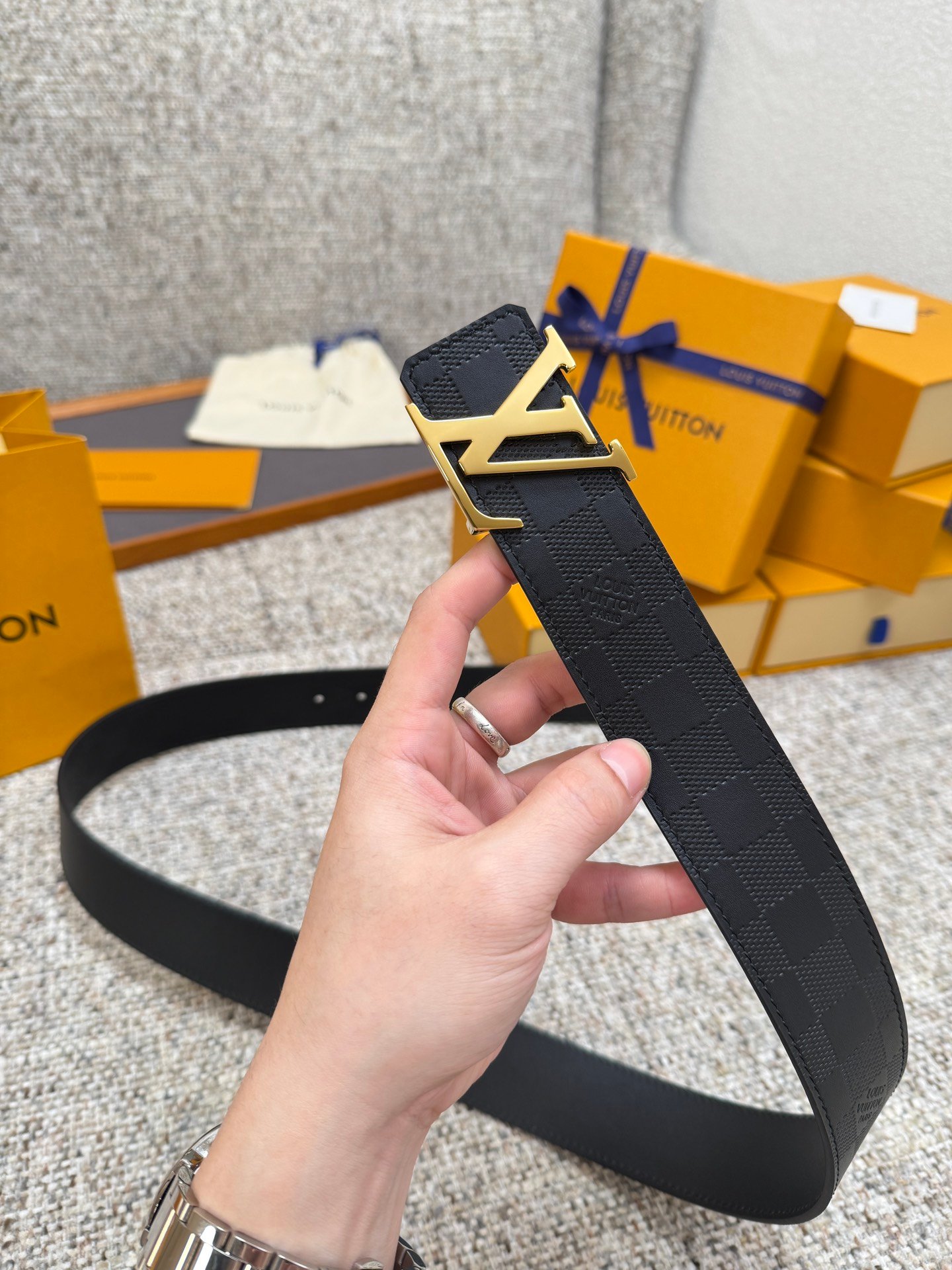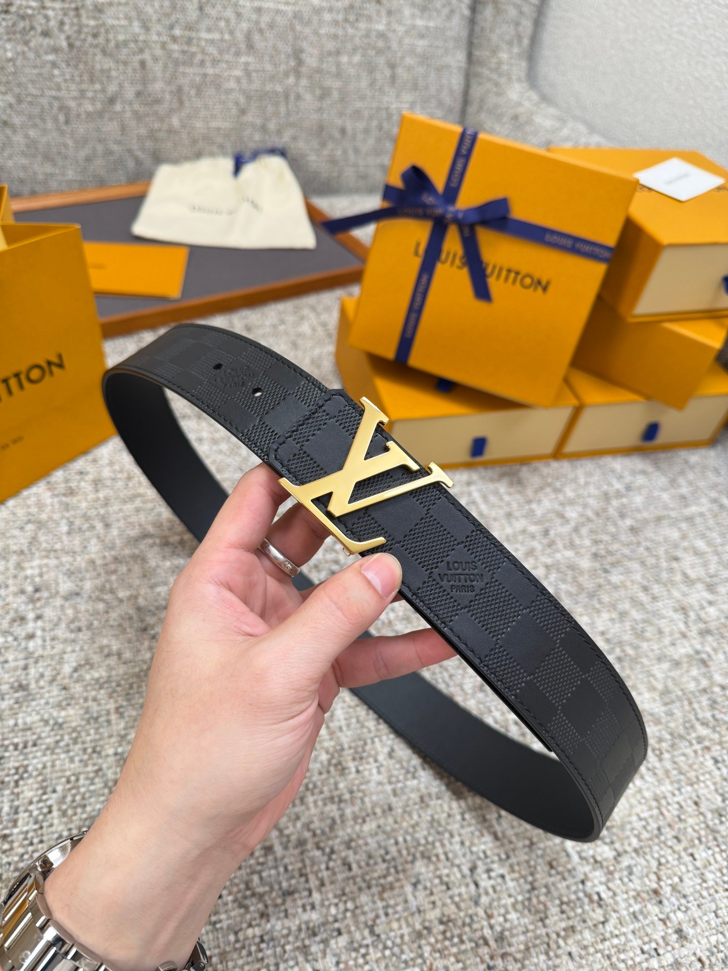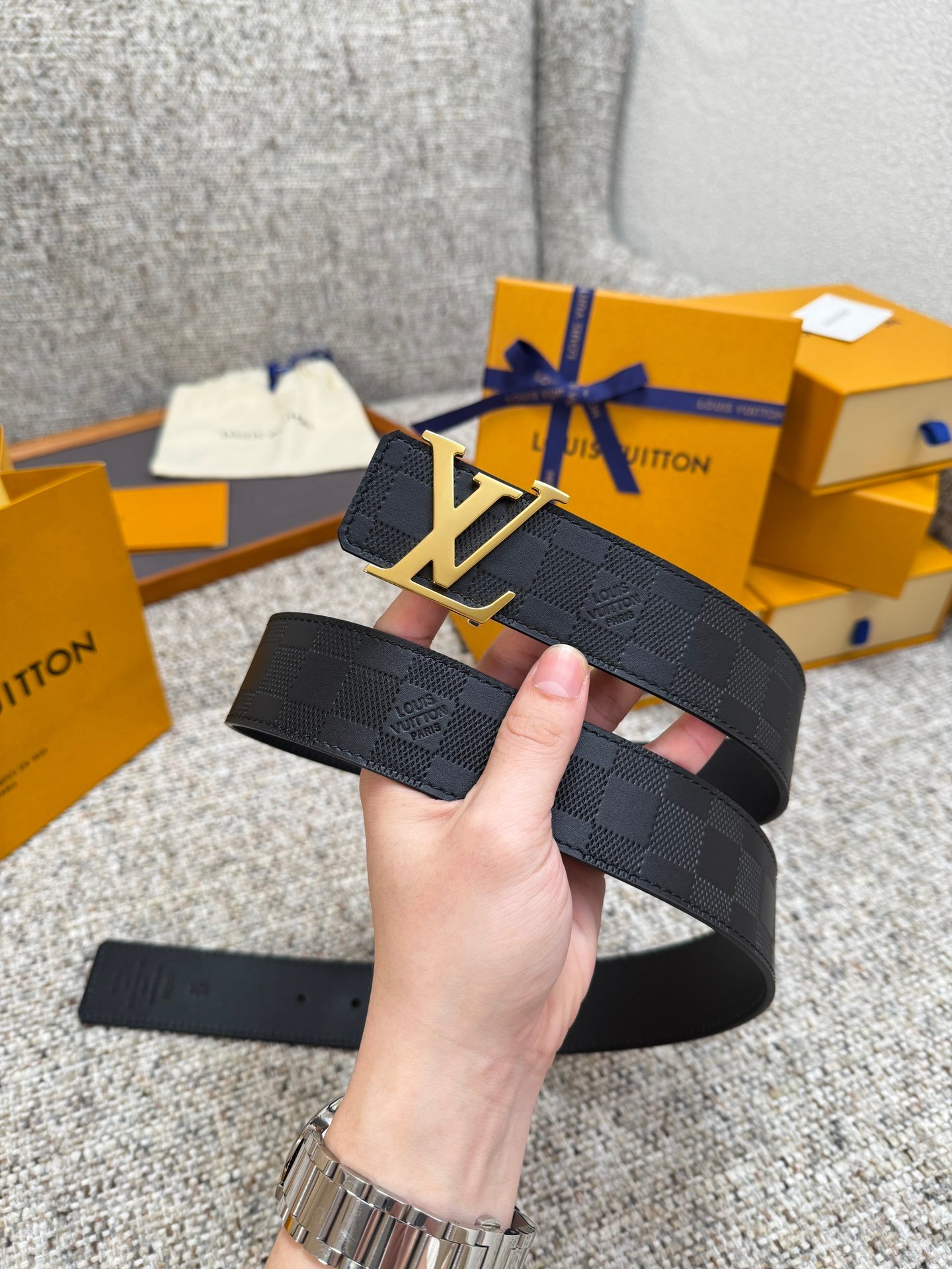 Polished Gold Signature LV BuckleAdorned with a polished gold-tone LV initials buckle, this hardware offers a warm, luxurious contrast to the black leather strap. The shiny metallic finish adds a bold, eye-catching touch, balancing the understated check pattern with opulent elegance.