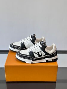Vintage Sport-Luxury SilhouetteThese sneakers feature Louis Vuitton’s signature retro athletic design, with a sleek white smooth leather and suede upper paired with iconic brown Monogram canvas overlays. The V-shaped cross LV pattern on the side creates a bold, distinctive focal point, blending timeless luxury with modern streetwear style.