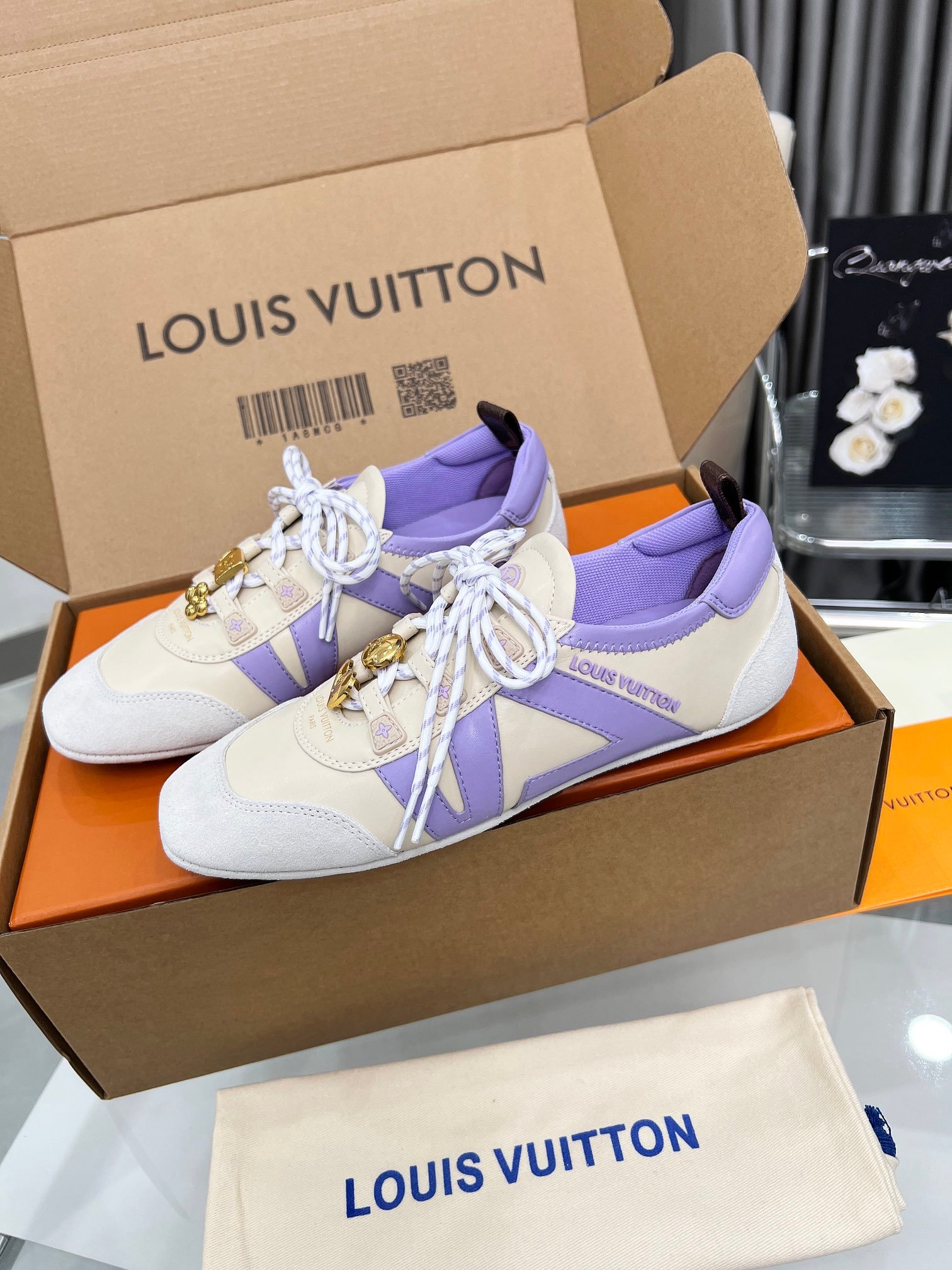Feminine Retro-Luxury AestheticThese sneakers blend Louis Vuitton’s iconic luxury design with a playful, feminine retro silhouette. The off-white leather and suede upper is paired with soft lavender purple accents, creating a sweet, eye-catching look that transitions seamlessly from street style to casual luxury settings.