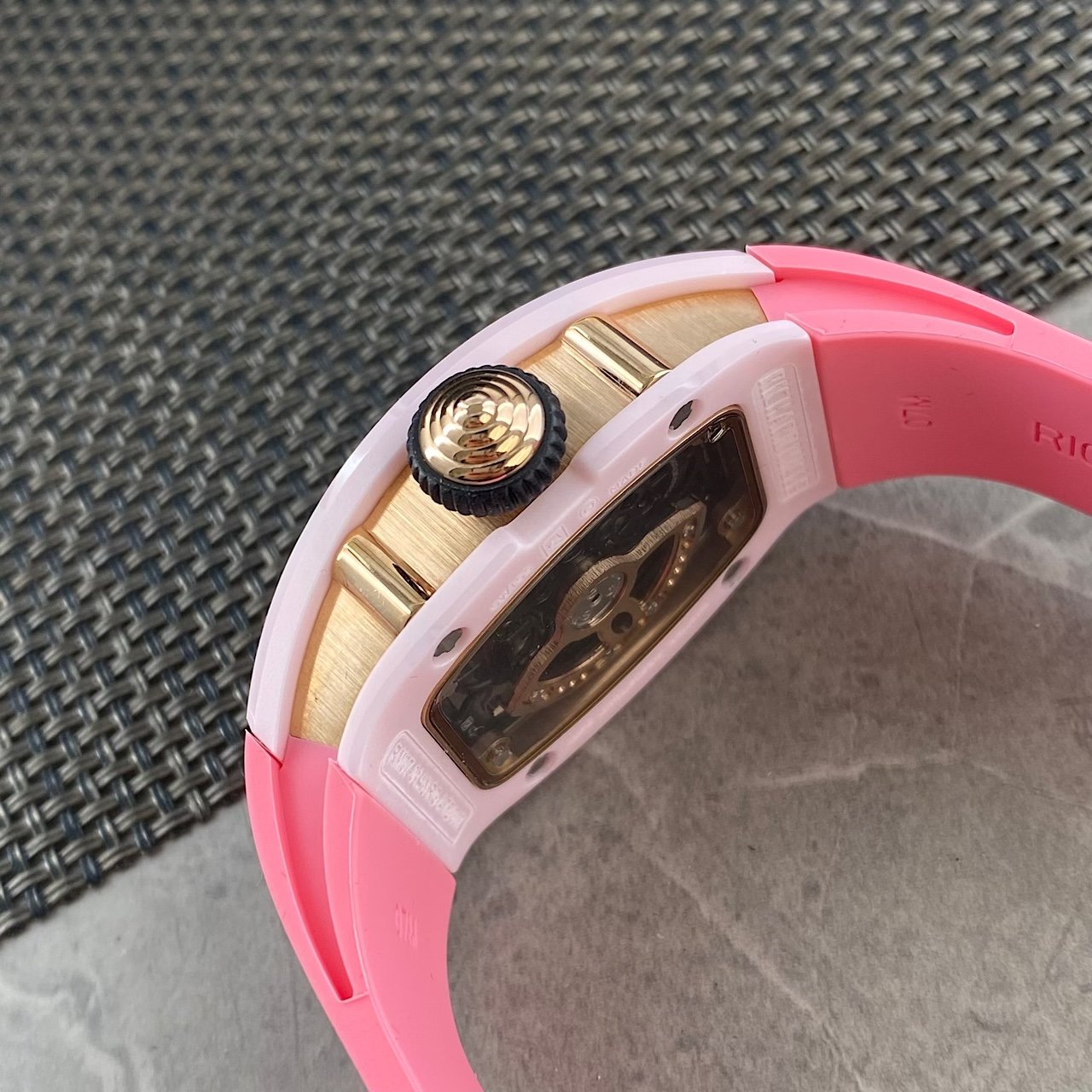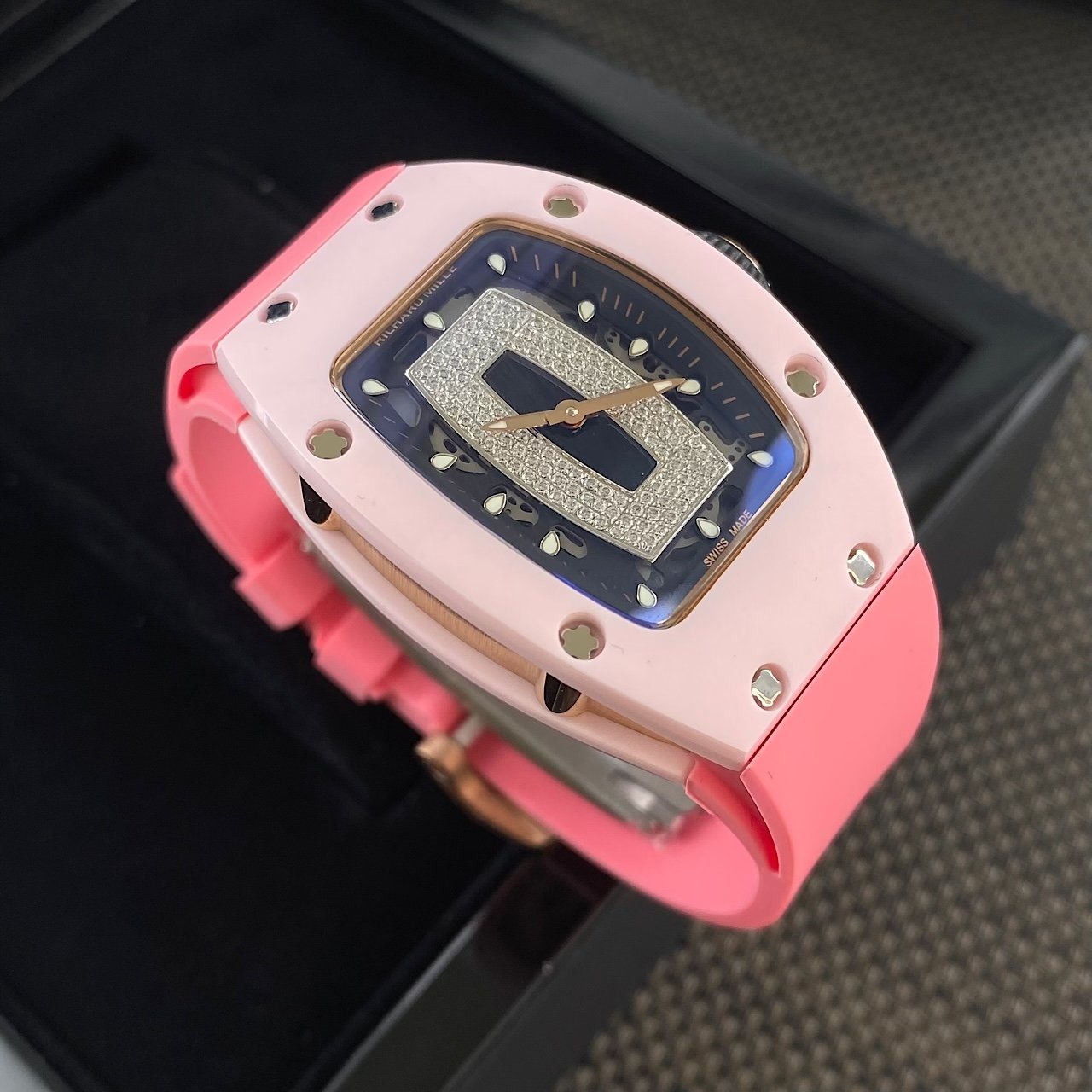 Iconic Richard Mille Tonneau DesignThis watch embodies Richard Mille’s legendary avant-garde design, featuring the iconic tonneau-shaped pink ceramic case. The bold, futuristic silhouette delivers a striking, feminine presence on the wrist, making it a highly coveted piece among collectors and luxury enthusiasts, perfect for making a statement at any occasion.
