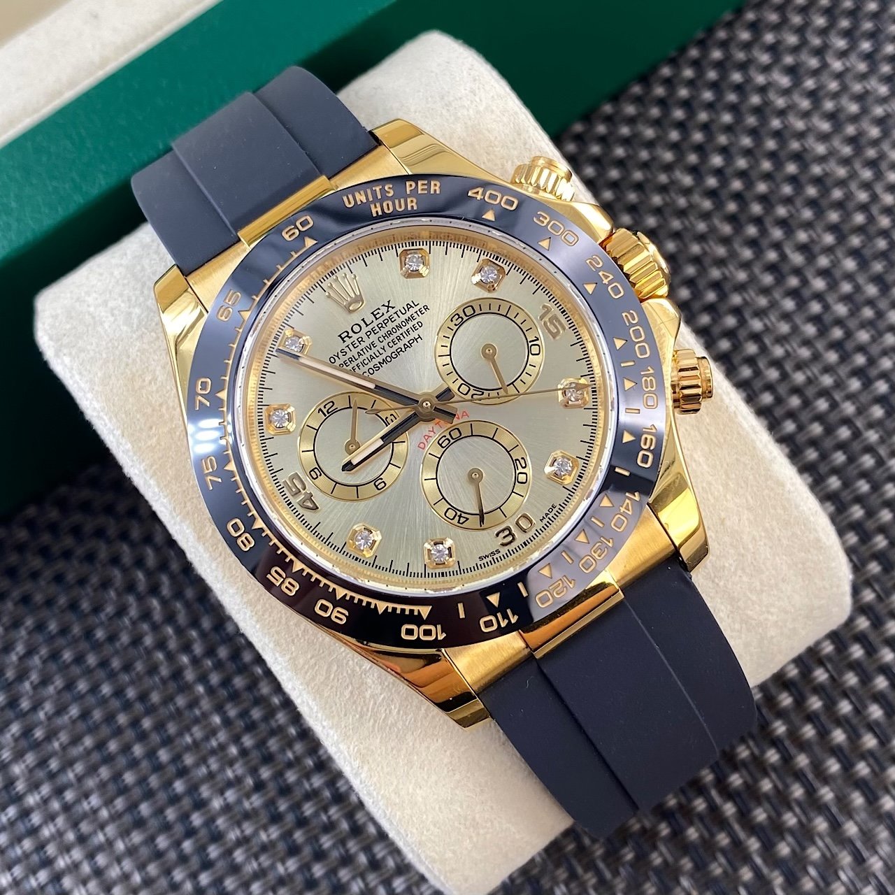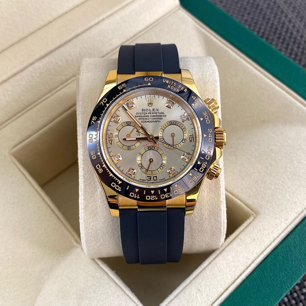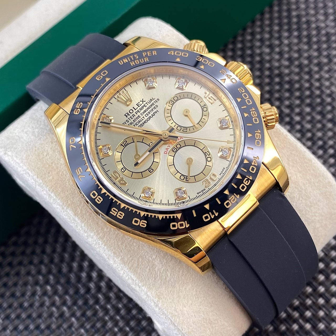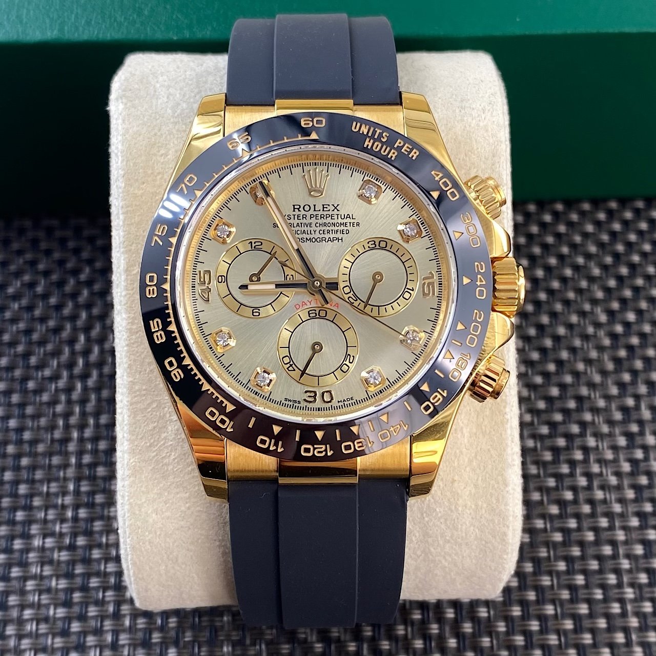 Rolex Cosmograph Daytona 40mm, Yellow Gold Tone Case, Ceramic Bezel, Diamond Dial, Oysterflex Rubber Strap, Automatic Chronograph Men’s Watch
